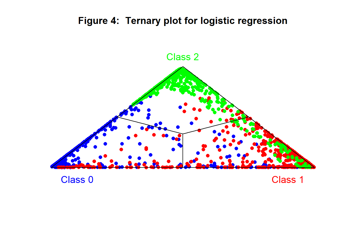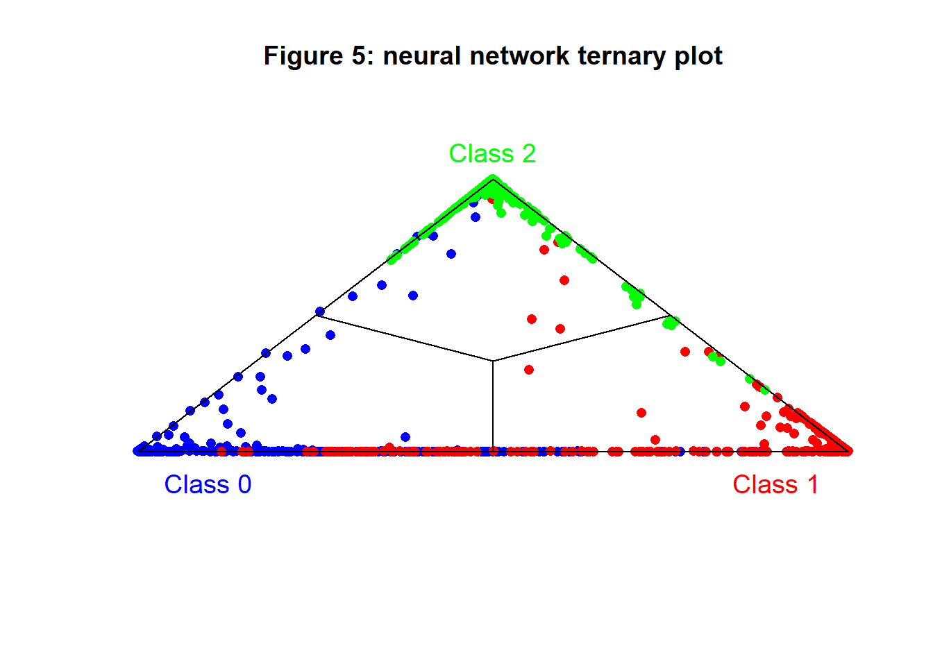 Figure 5 shows the ternary plot for the neural network. Notice how the neural network pulls the points towards the triangular frame of the plot. Very few points have an uncertain classification.