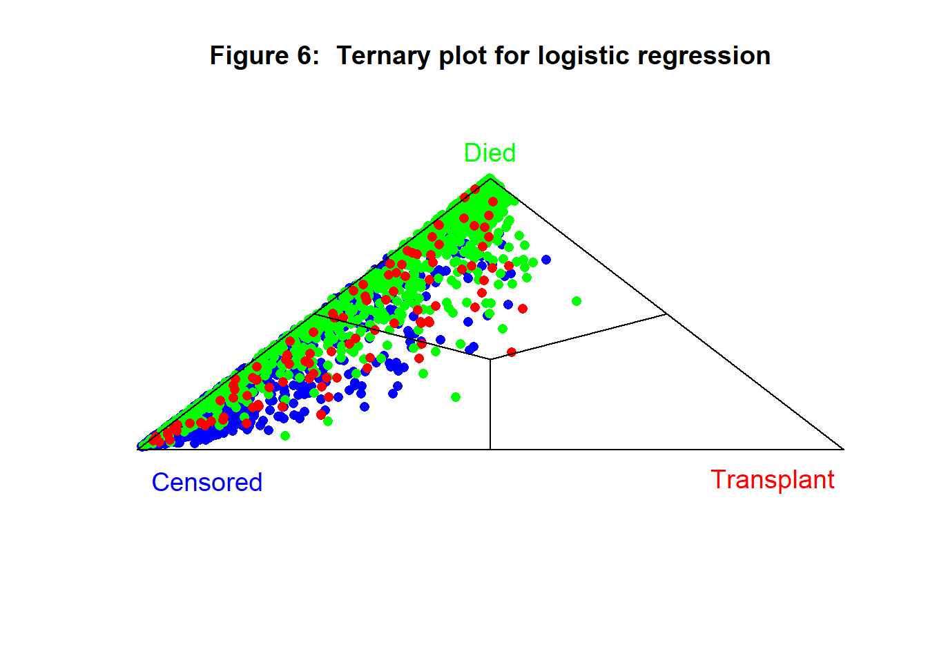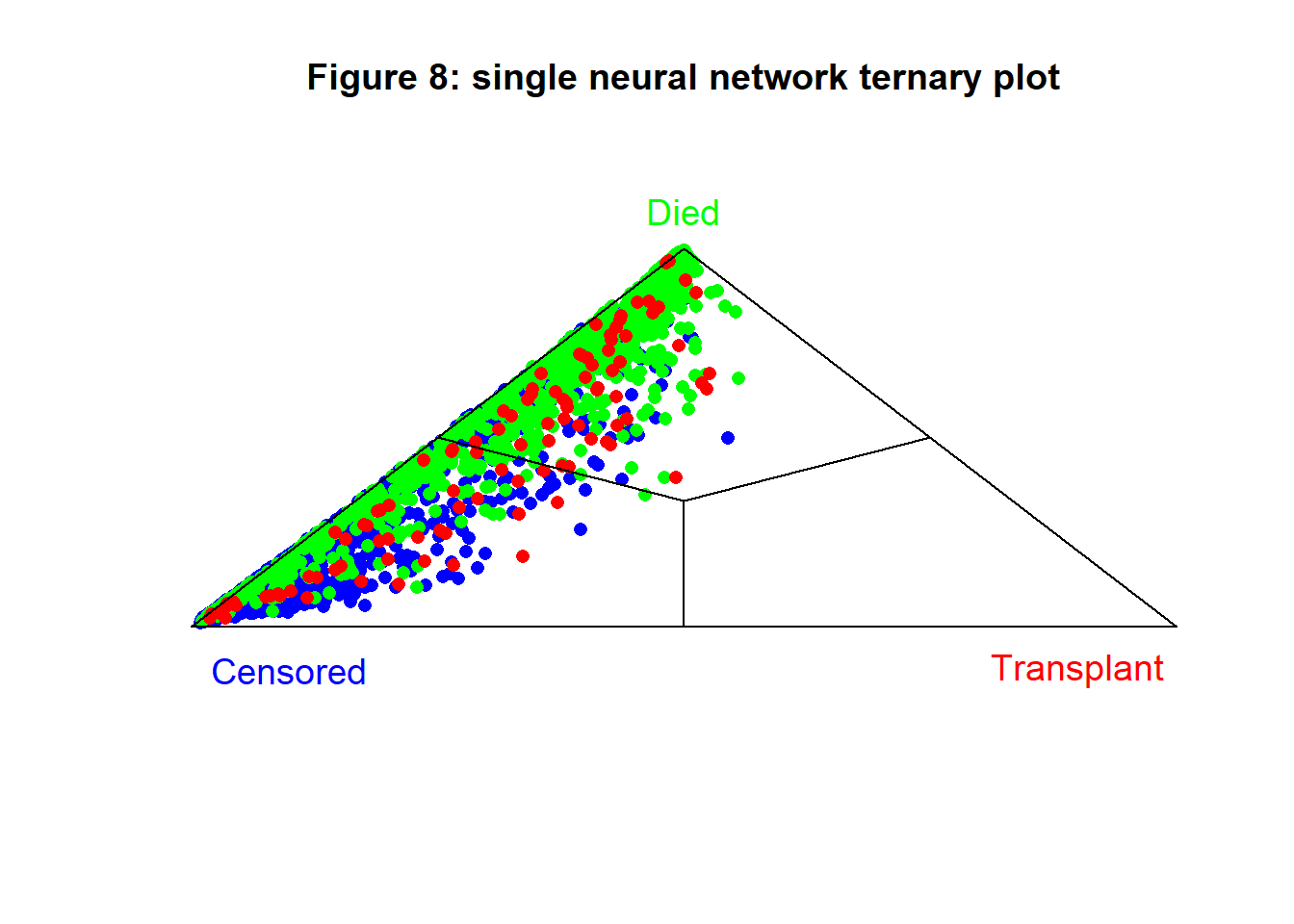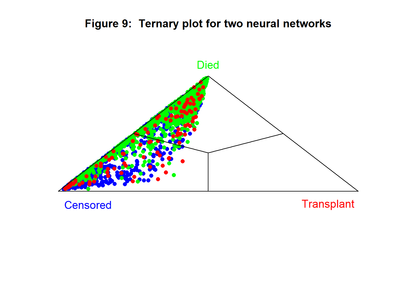 The ternary plot for the test sample is shown in figure 6, it confirms the generally poor performance of the model and the particular difficulty of identifying the transplant patients.