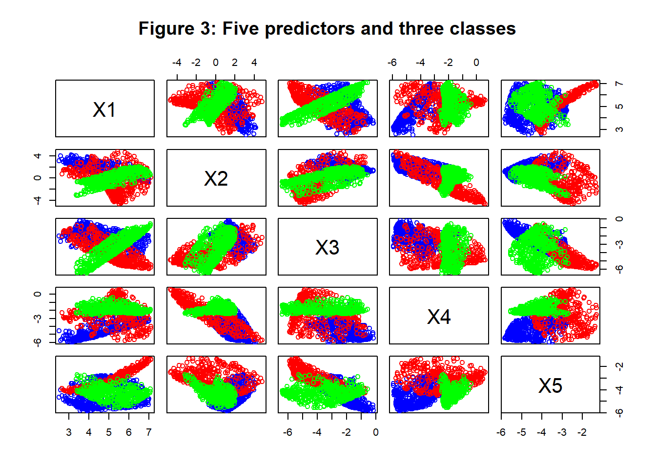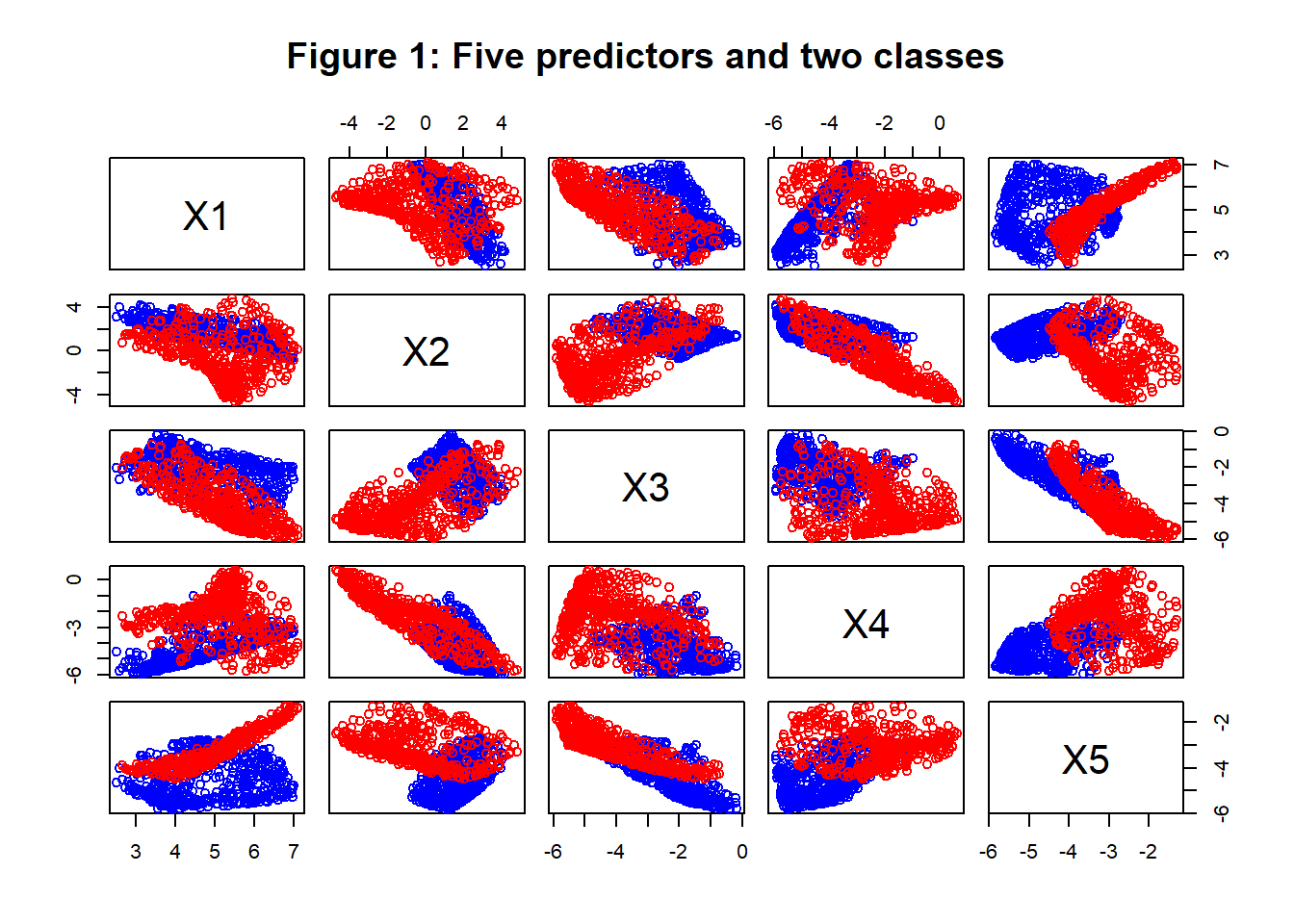 Figure 1 shows the distribution of the 5 predictors in the two classes. The values of the predictors for class Y=0 are shown in blue and those for class Y=1 are shown in red.