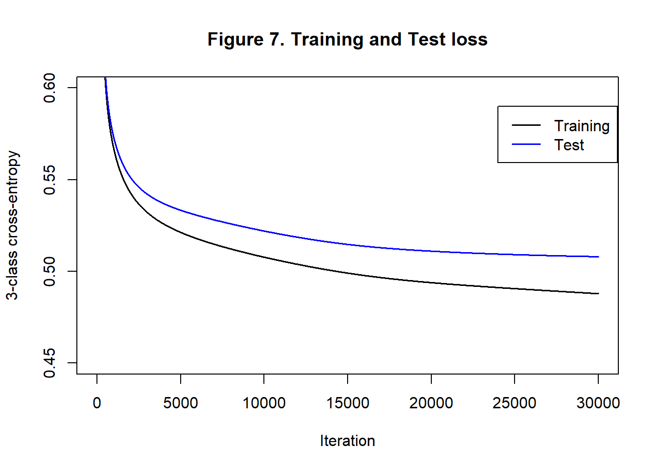 The training cross-entropy loss is reduced to 0.488 and the corresponding test loss is 0.508, not much better than logistic regression. As a check, I continued the algorithm for more iterations, but the test loss did not drop much further and after 80,000 iterations it started to increase. The confusion matrix shows that 20.3% of the test sample are misclassified by a largest probability rule, slightly worse than logistic regression.