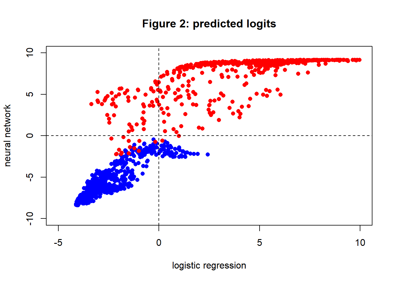 Figure 3 shows the predicted logit probabilities (log[p/(1-p)]) for the logistic regression and plotted against the logits of the neural network prediction. The separation of the points projected on to the neural network axis is clearly much better than the separation of the points projected onto the logistic regression axis. The points that are misclassified by one method and correctly classified by the other appear in the top left and bottom right sections of the plot. You will see that there is only one point that is correctly classified by logistic regression, but wrongly classified by the neural network. It is a red dot quite close to the intersection of the dashed threshold lines.