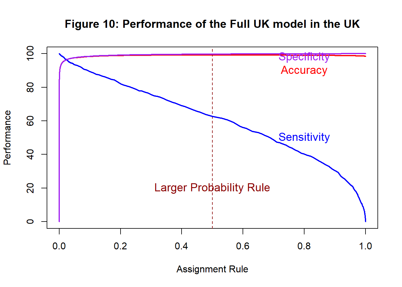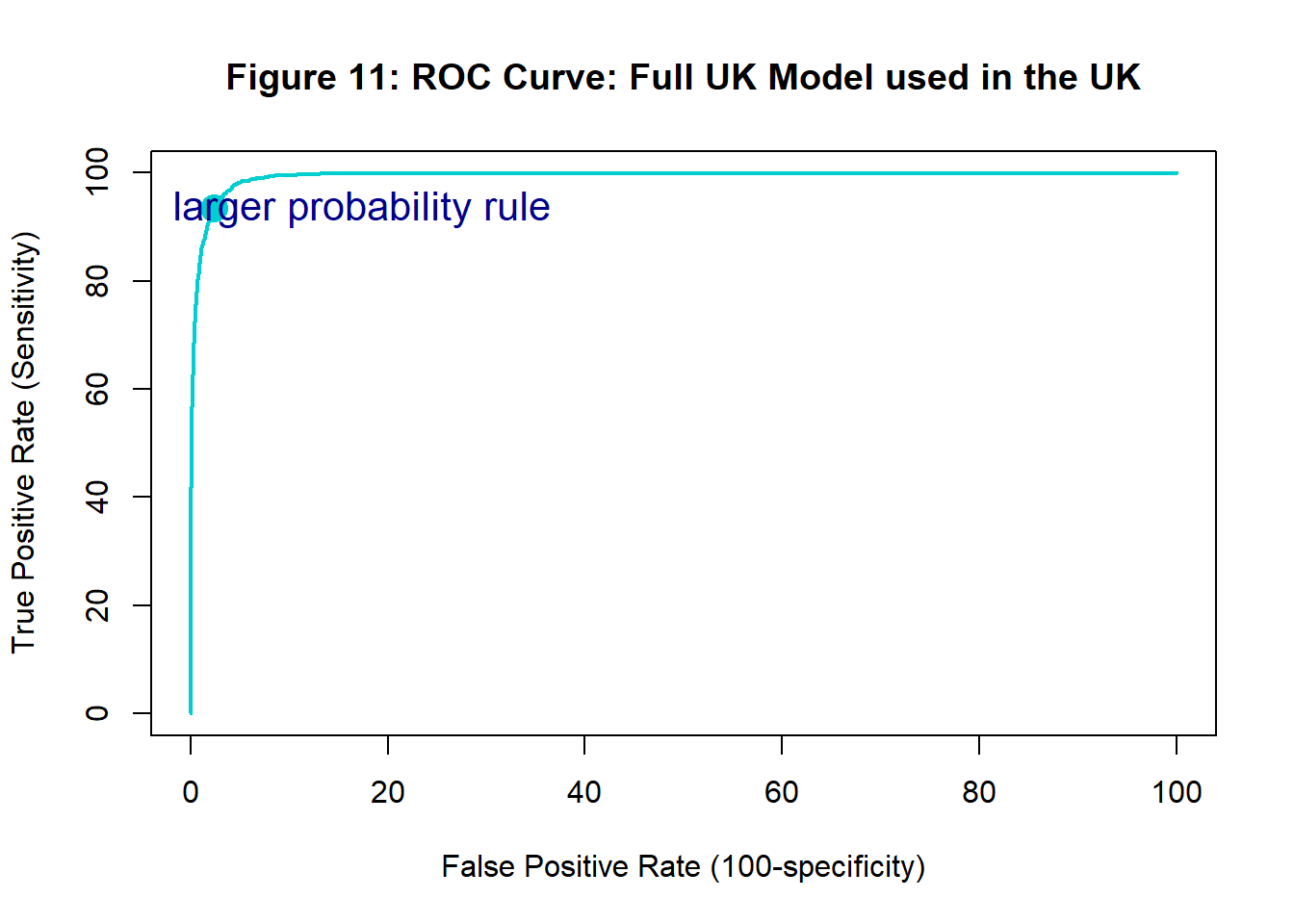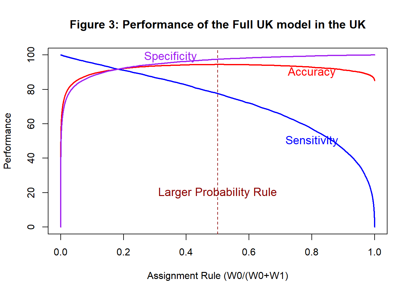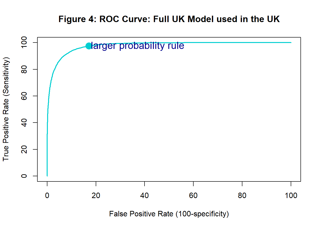 Every possible assignment rule corresponds to a particular point (combination of sensitivity and specificity) on the ROC curve. Figure 4 shows the UK model’s ROC curve and highlights the point corresponding to the larger probability rule.