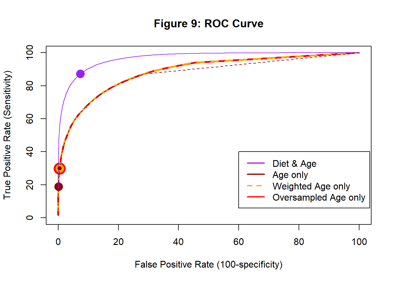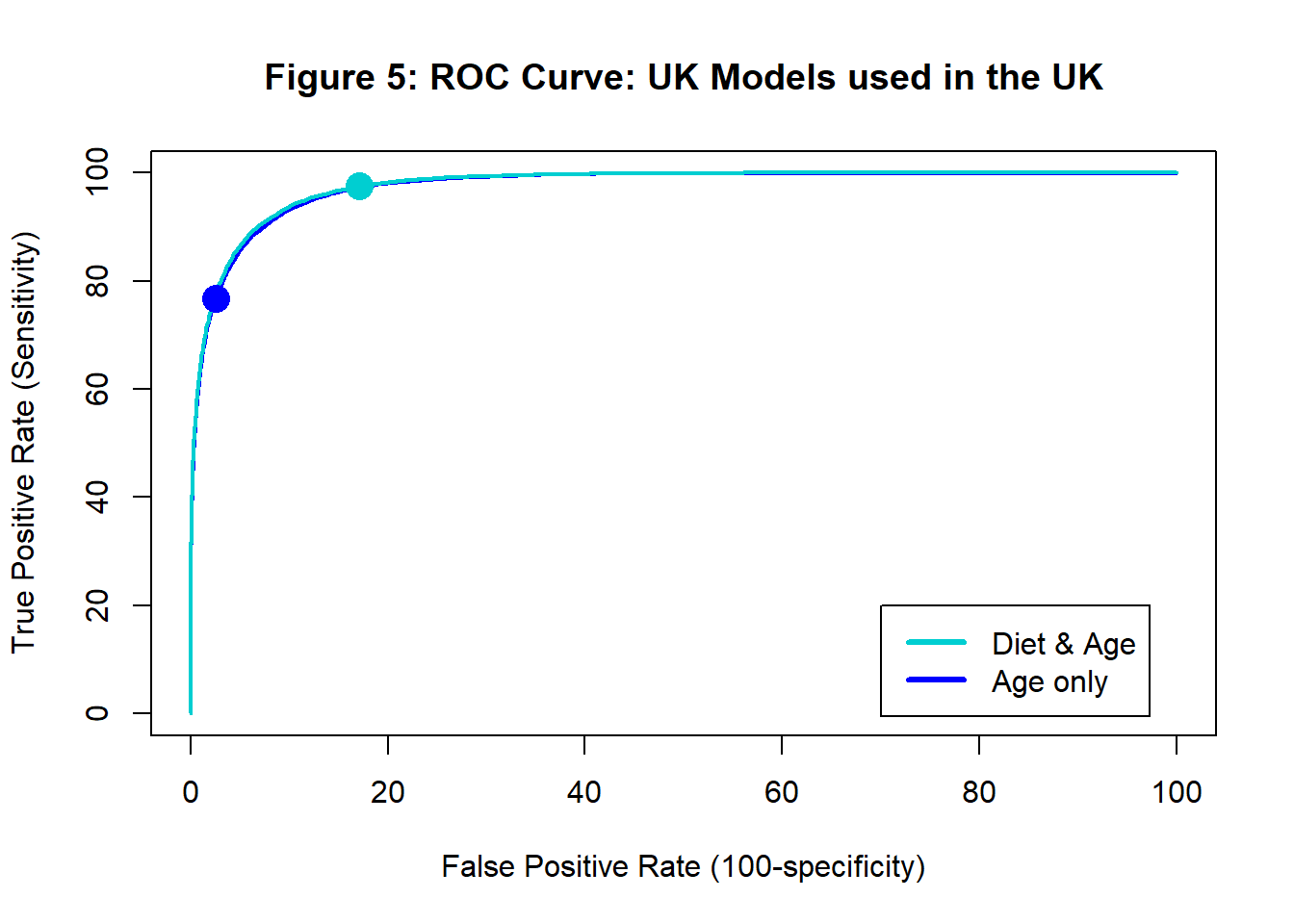 Figure 5 shows the ROC curve for the age only model with the ROC curve of the original (age and diet) model shown in a lighter blue. The points corresponding to the the “larger probability rule” are highlighted. The difference between the performances of the models as measured by the AUC is tiny, because the measure of poor diet does not vary much in the UK.