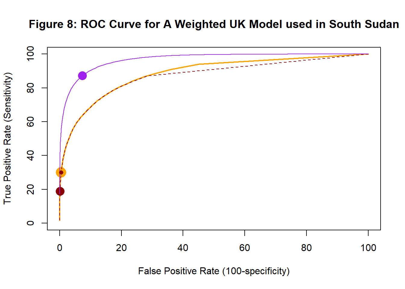 In the UK, the models with and without diet performed more or less equally well, but in South Sudan the model without diet performs much worse and the “larger probability” rule would identify under 20% of the babies with the condition. The age only model is calibrated for use in the UK not South Sudan, but perhaps a different assignment rule would help correct for the miscalibration. Looking at the ROC curve, it seems that it would be possible to find an assignment rule for use with the age only model that has specificity and sensitivity that are both close to 80%.