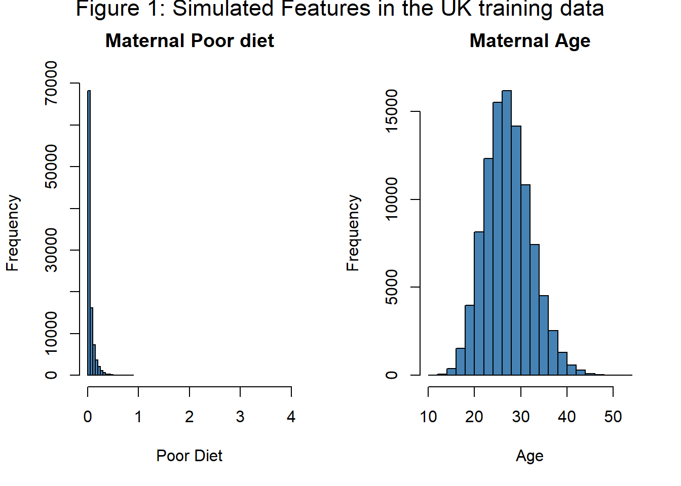 In the first simulation, I imagine that I have training data on 100,000 UK births and that I want to predict a condition in the babies that has a prevalence of about 15%. The chance of the baby being affected by the condition depends on the mother’s age and the quality of the mother’s diet. Having developed the model and measured its performance, I’ll imagine applying the UK trained model to the screening of babies in a very poor country with a more deprived diet. I’ll call this second country, South Sudan as I think that this is currently the world’s poorest country.