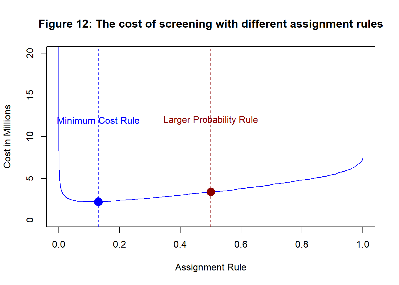 Using 1.5% as the prevalence, the average cost per baby of the program is 500x(0.015xsensitivity/100+0.985x(100-specificity)/100 )+5000x0.015*(100-sensitivity)/100. Figure 12 shows the cost in millions of screening 100,000 babies, using different assignment rules