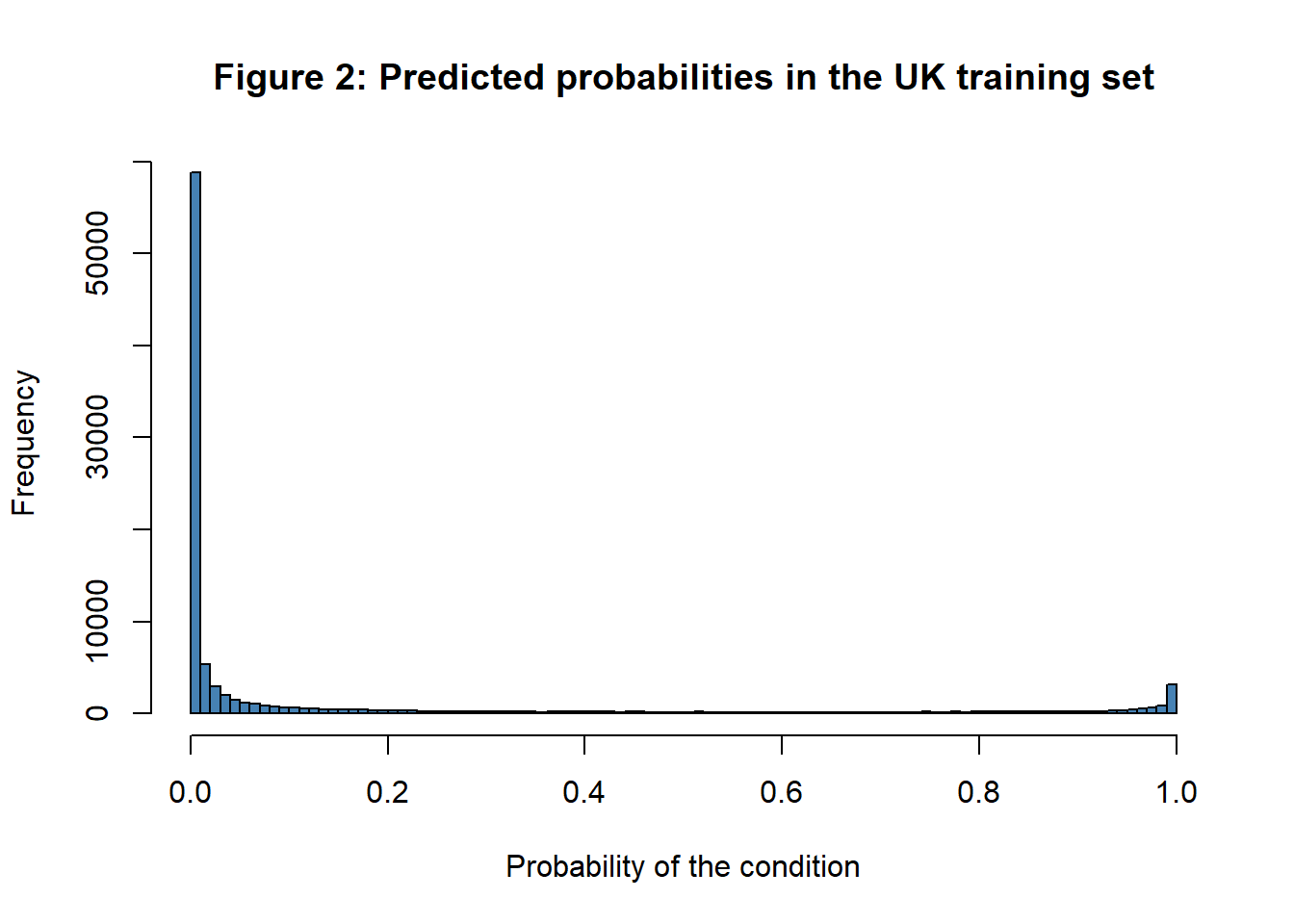 If we look at the probabilities predicted by the model, they also follow the pattern that we would expect, with most probabilities close to 0 or 1. Overall, the model does a good job of predicting the condition. The average of the probabilities predicted by the model is 0.153, which corresponds to the prevalence of the condition in the UK.