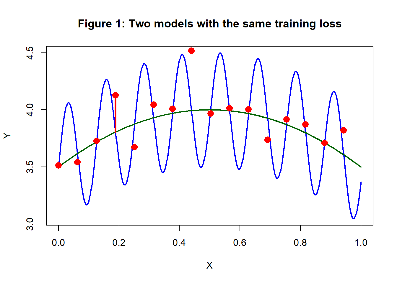 Figure 1 is designed to challenge your concept of overfitting. It shows two models fitted to the same red training data, one model is in blue and the other is in green. The question is, which of the models overfits?