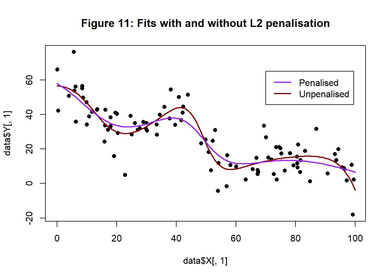 These values are broadly in line with what I intended. In figure 11, the new fitted curve is shown in purple, with the unpenalised curve is in brown. The penalised algorithm does produce a slightly less wavy curve.