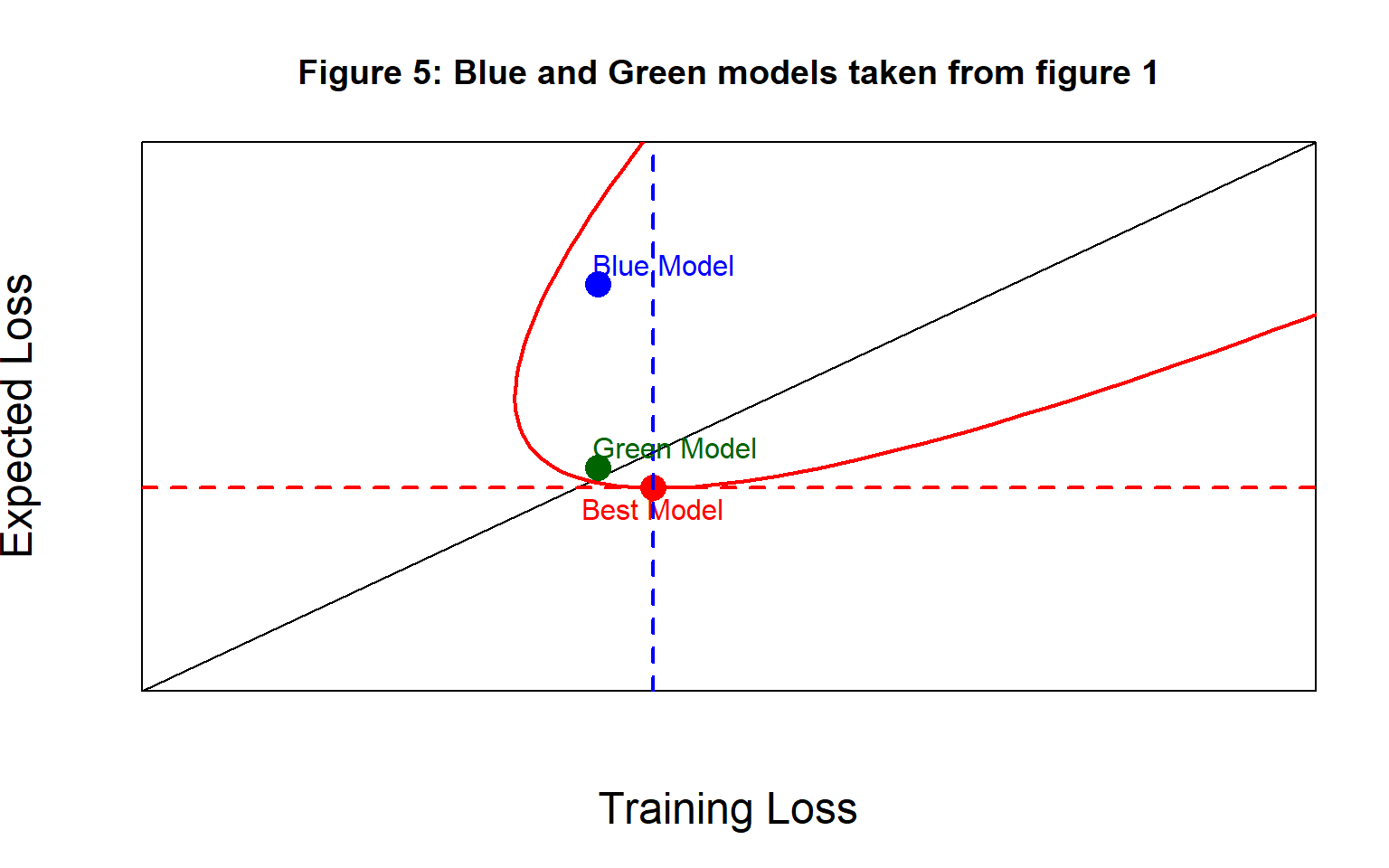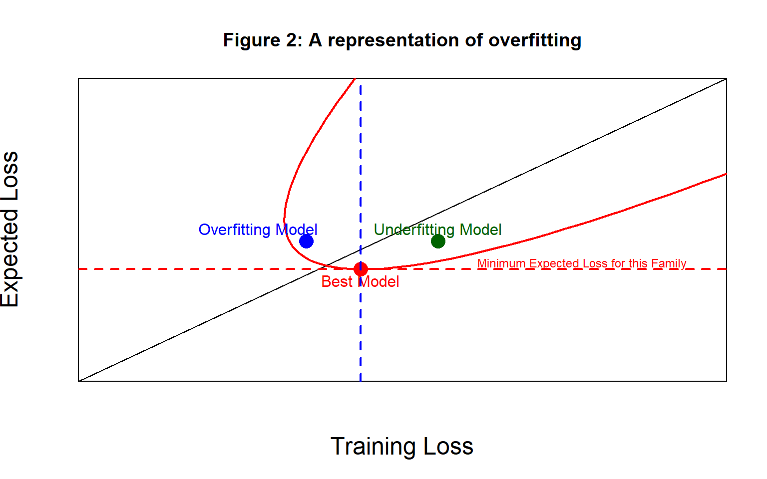 Notice that I have deliberately chosen to define overfitting without reference to the model’s expected loss. If you don’t like my approach, this choice is probably at the heart of our disagreement. The diagonal line shows equality between the expected loss and the training loss, so an overfitting model can have a training loss that is larger than the expected loss (below the line of equality) or it can be smaller (above the line).