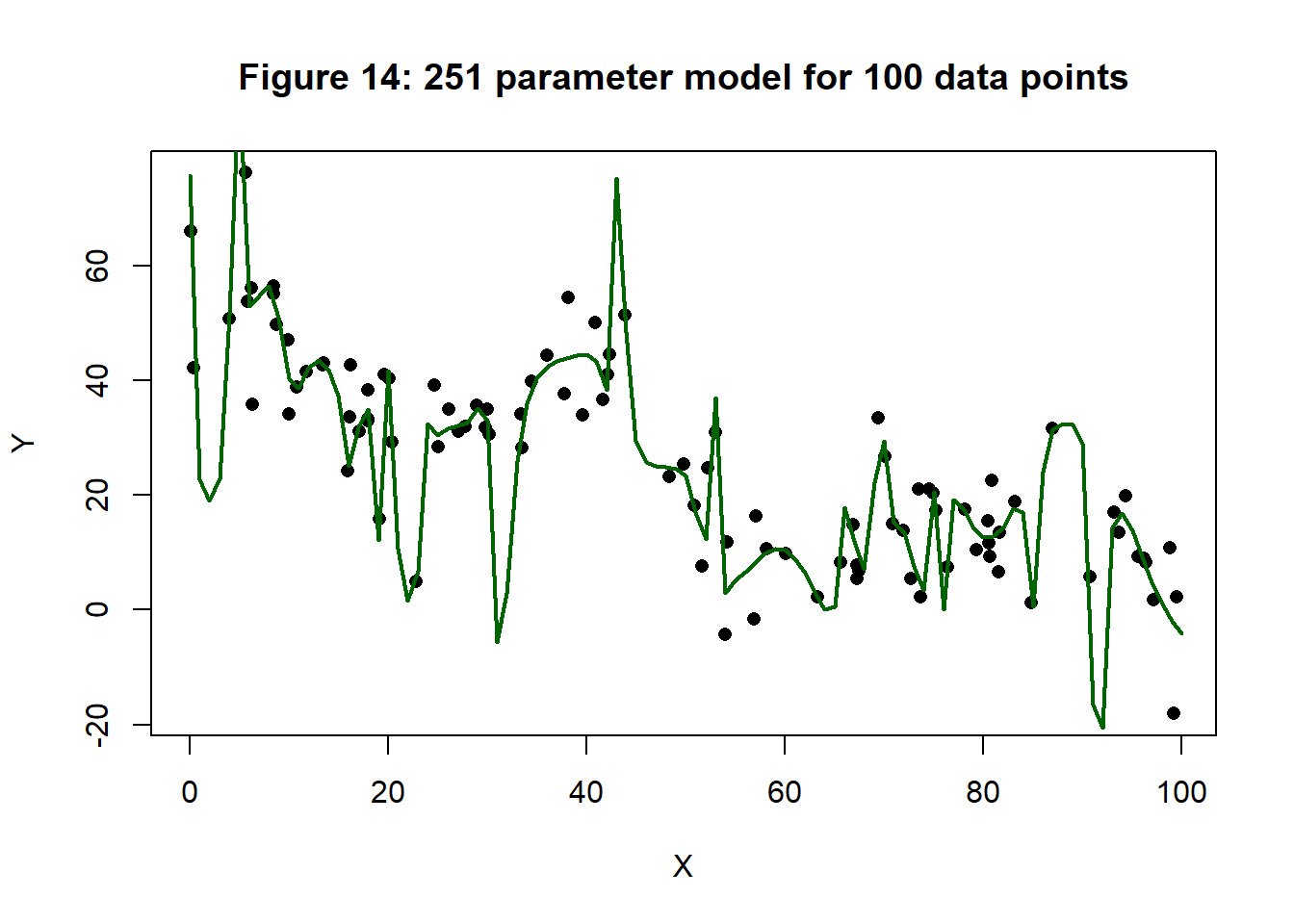 In this section, I fit a (1, 10, 10, 10, 1) neural network to the same set of training data. This model has 251 parameters, more than there are points in the training data (100). I fitted by gradient descent with one million iterations and a step length that started at 0.1 and dropped by 10% every 50,000 iterations. Figure 14 shows a plot of the resulting fit.