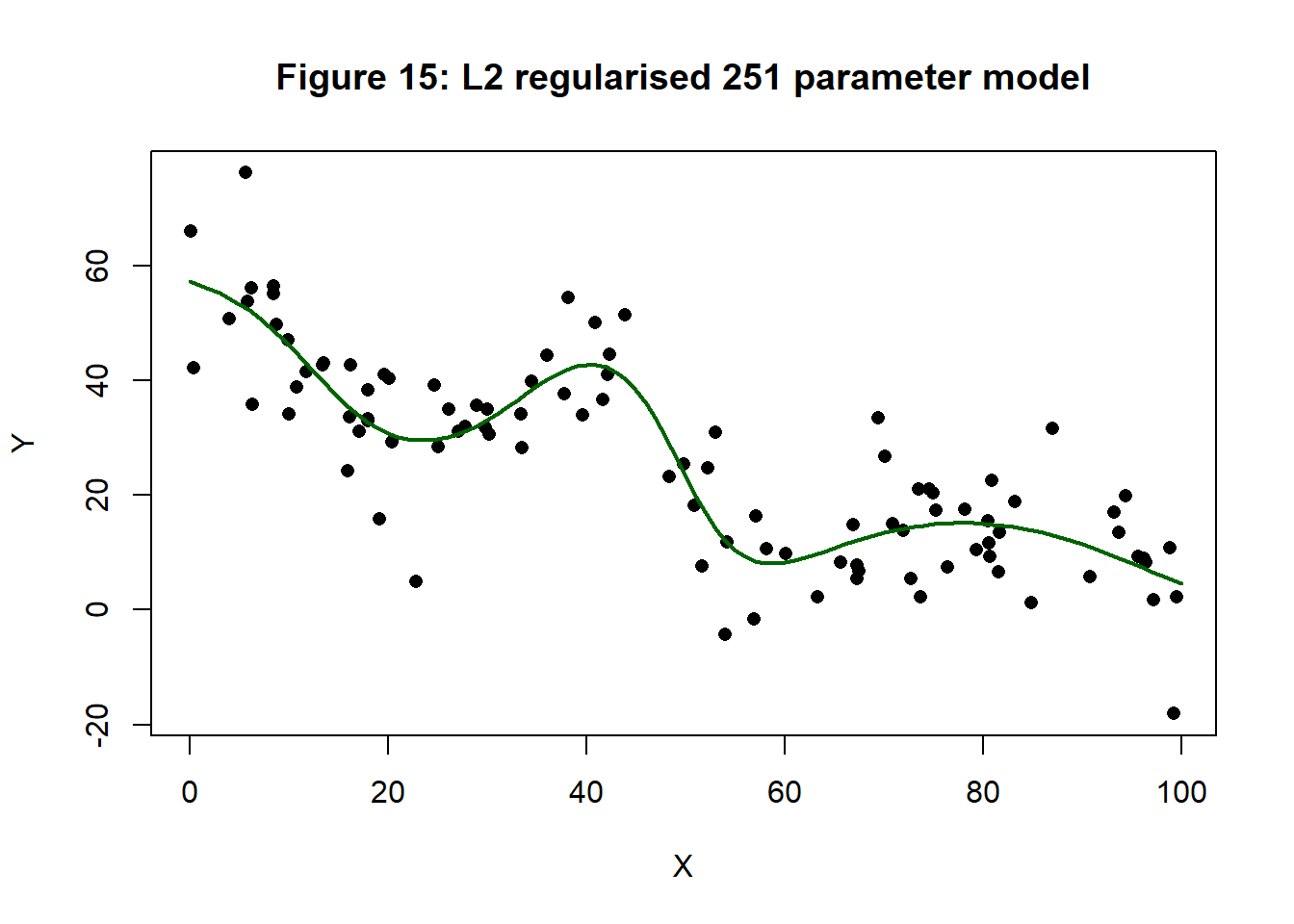 The test MSE for the L1 penalised model is 96.507. In this example, it looks as though L1 penalisation has over-done the damping of the curve, but I did try for a dramatic effect.