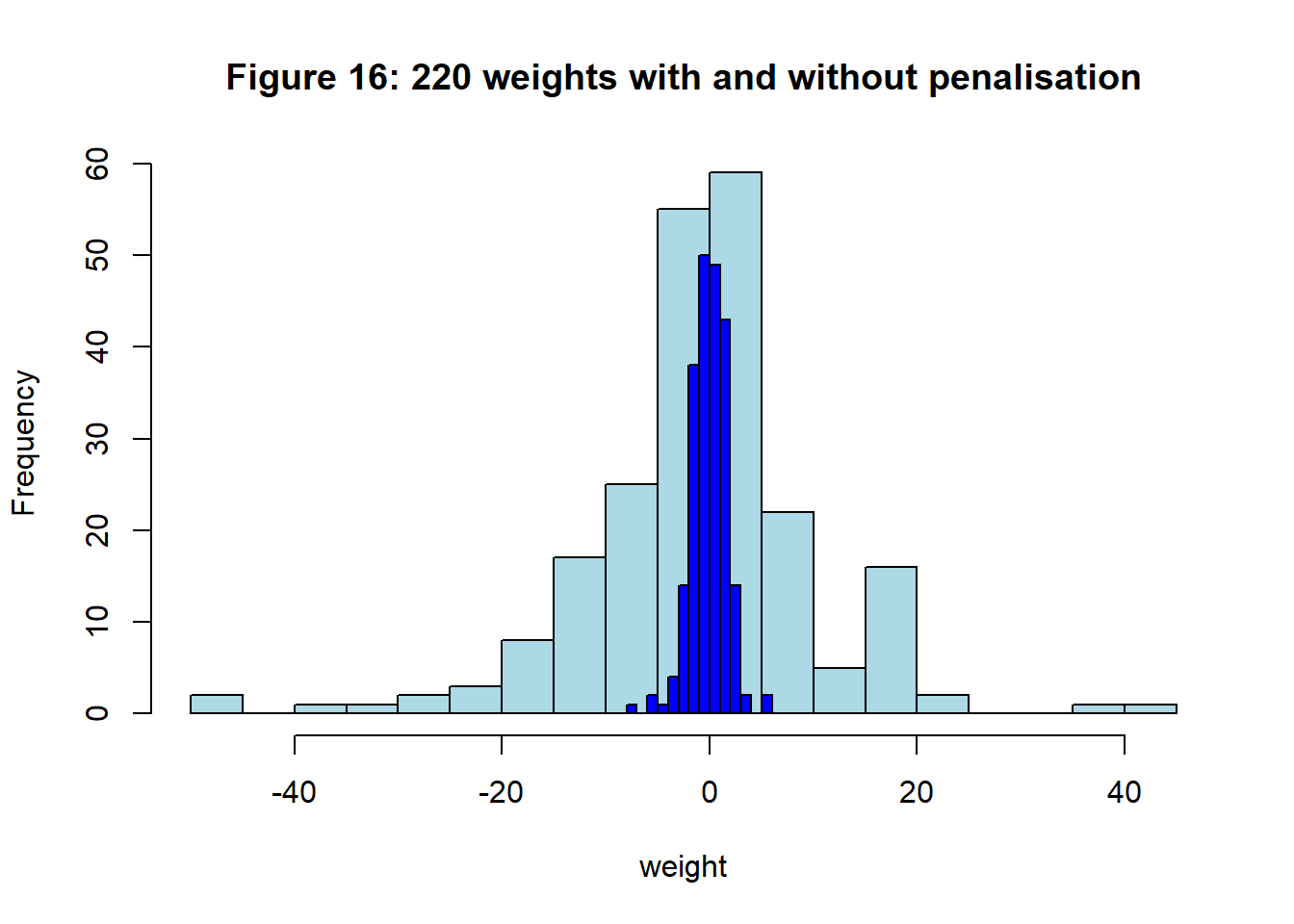 The effect is remarkable. Figure 16 shows a histogram of the 220 weights for the models with (dark blue) and without (light blue) L2 penalisation.