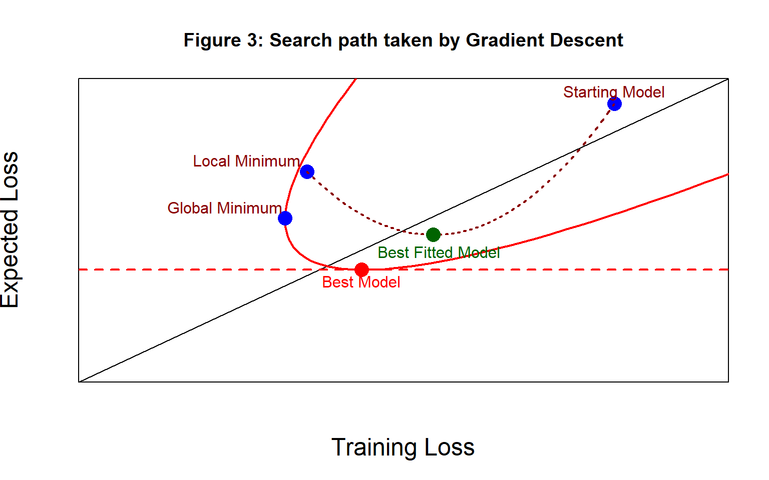 In figure 3, the path taken by the algorithm is shown as a brown dotted line and the point along the path with the minimum expected loss is the model that you would ideally likely to choose and it is shown as a dark green dot. I’ll refer to it as the best fitted model. It so happens that for this algorithm and these starting values, the best fitted model underfits the data.
