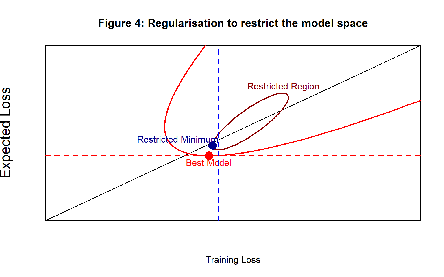 Figure 2 shows the model space for a particular analysis by the red parabolic shape, perhaps it might include all possible (4, 5, 2) neural networks. The best possible model within the chosen family is the one with the lowest expected loss and it is represented by a red dot.