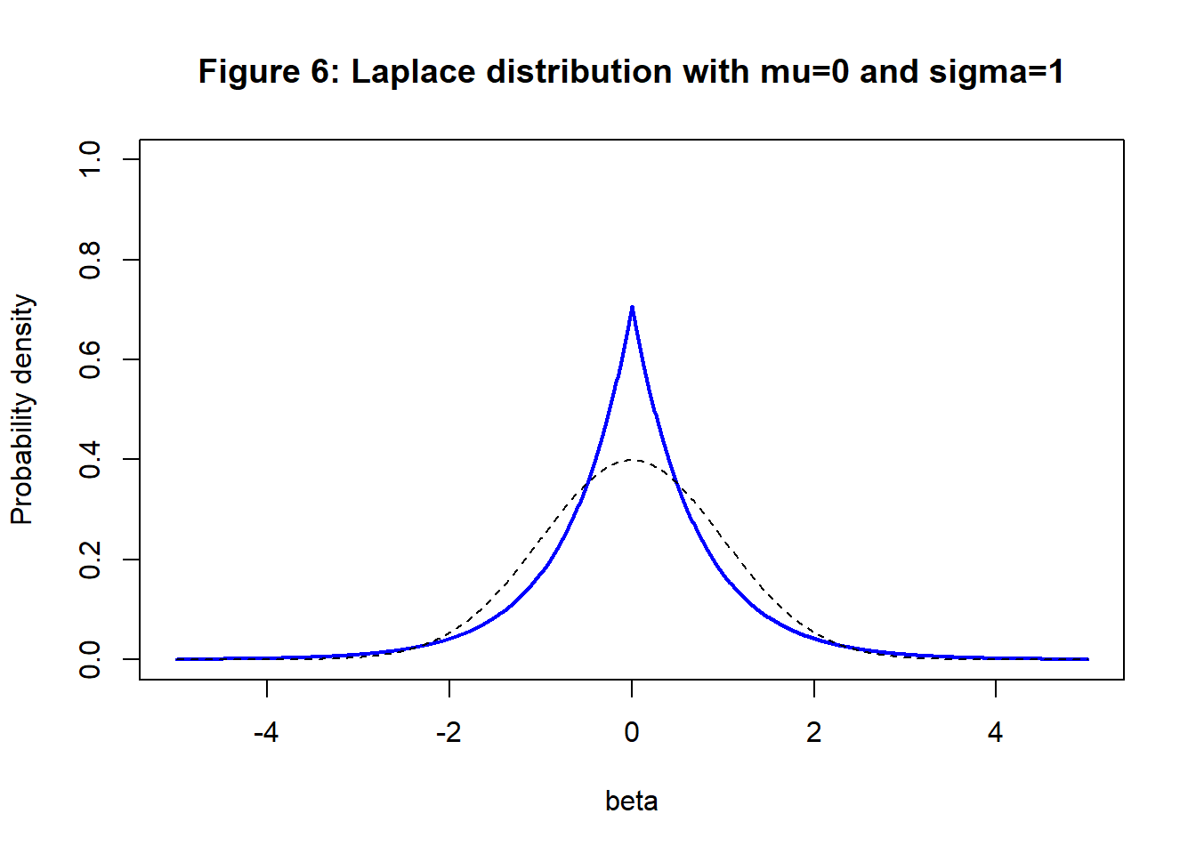 In much the same way, a Laplace prior leads to the L1 penalty, \[ \lambda\sum_{i=1}^m |\beta_i| \] The Laplace prior has the form \[ p(\beta) = \frac{1}{\sqrt{2} \sigma_\beta} exp \left\{ -\frac{\sqrt{2}| \beta - \mu_\beta |}{\sigma_\beta} \right\} \] This distribution has longer tails and is shown in figure 2. A Laplace(0, \(\sigma_\beta\)) prior is appropriate if you believe that most of the biases will be close to zero with a few large biases. In figure 2 a standard normal distribution is shown as a dashed line for comparison.