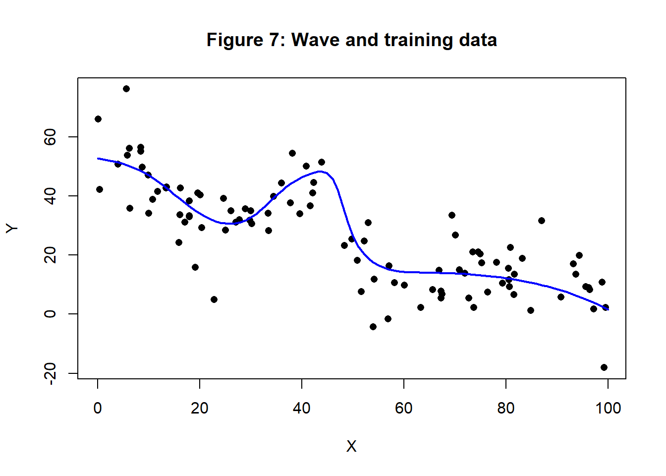 In some of my earlier posts, I have analysed simulated data with a pattern that I call a wave. The generating curve and a set of 100 training values is shown in figure 7.