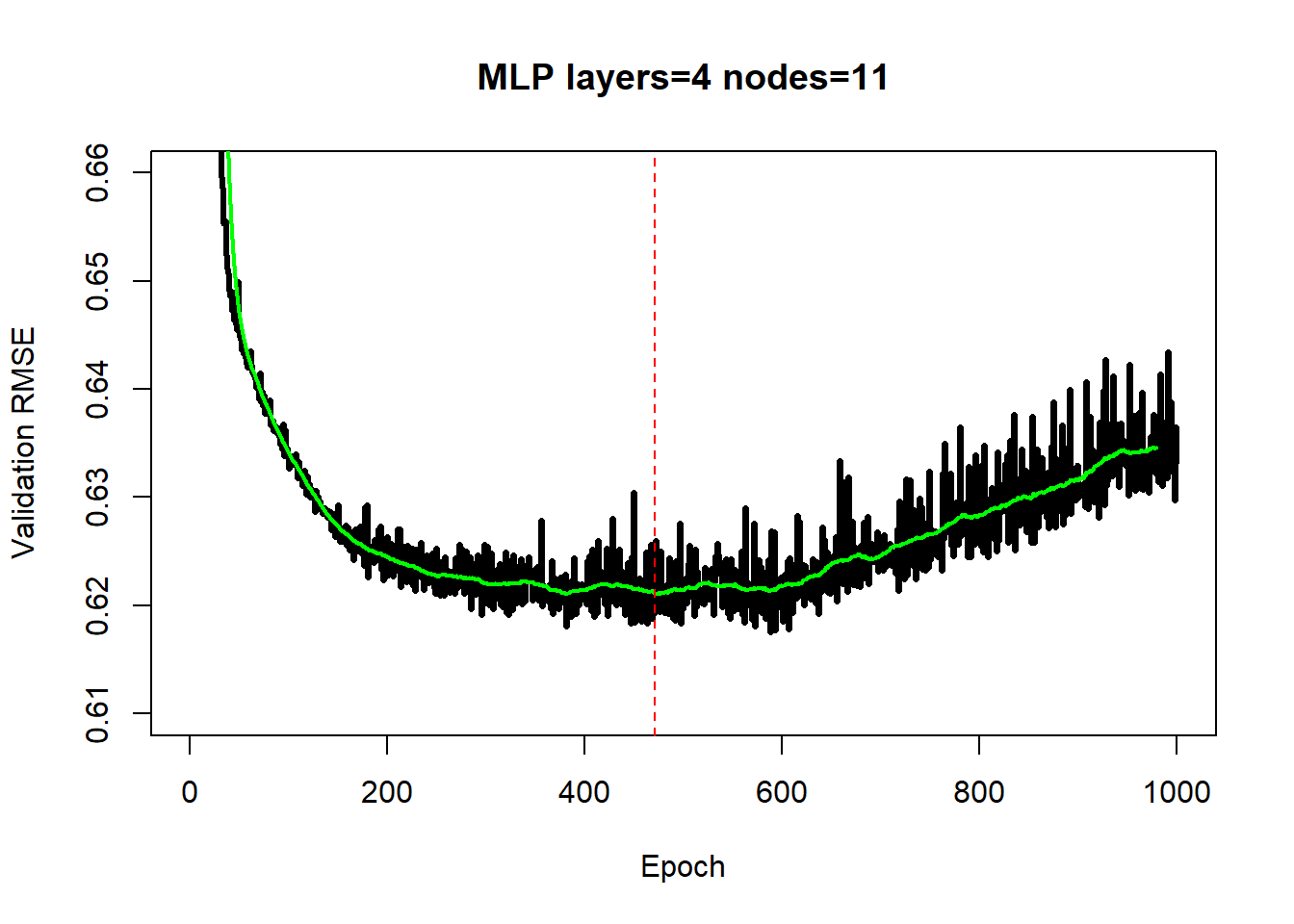 For the MLP model the best set of hyperparameters is 4 layers of 11 nodes each run for 471 epochs. This model has 496 parameters, corresponding to approximately 5 observations per parameter (opp)) and the validation RMSE is 0.621 (R2=61%). The figure below shows the history of the validation RMSE. The stochastic nature of the adam algorithm creates the fluctuation in the RMSE and demonstrates the importance of the smooth, which overlaid in green.