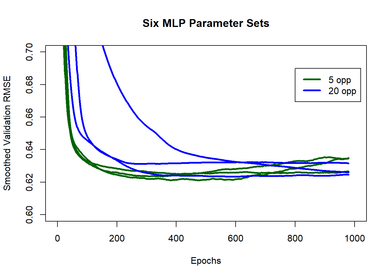 Below is the plot of the smoothed histories of all six MLP models. They all reach a similar performance level, but at different rates. Smaller models (opp=20, parameters=150) improve at a slower rate over the early epochs and their amount of overfitting by epoch 1000 is minimal.