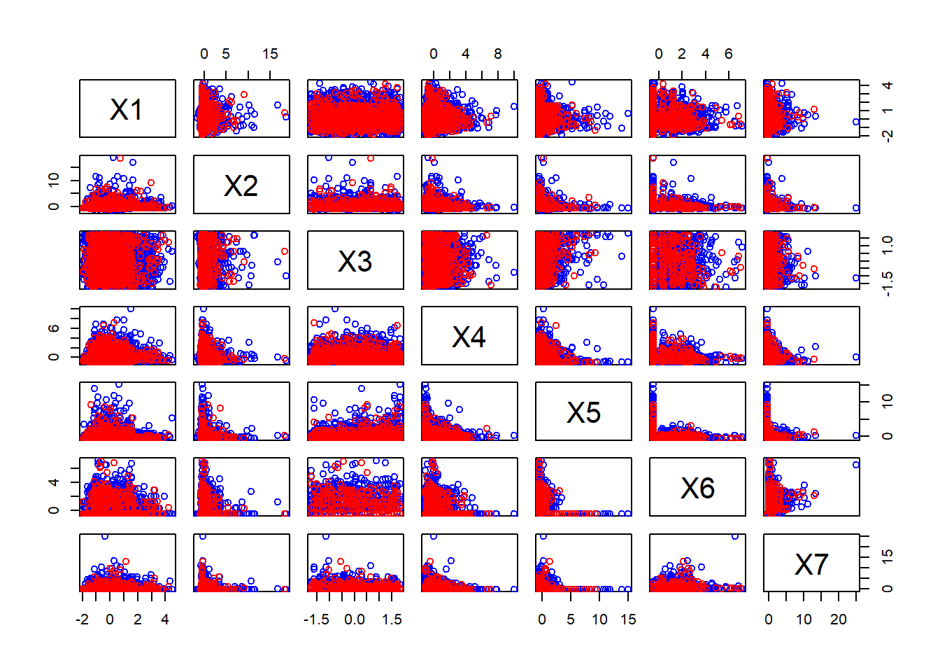 The plot shows the seven continuous standardised features with points plotted red if the contact was successful and blue if not. Several of the features are extremely skewed.