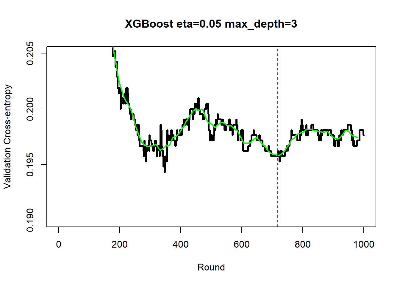 The next plot shows the history of the validation RMSE for the best combination of eta and max_depth (in black), overlaid with the smooth(in green). The optimum number of rounds is 442.