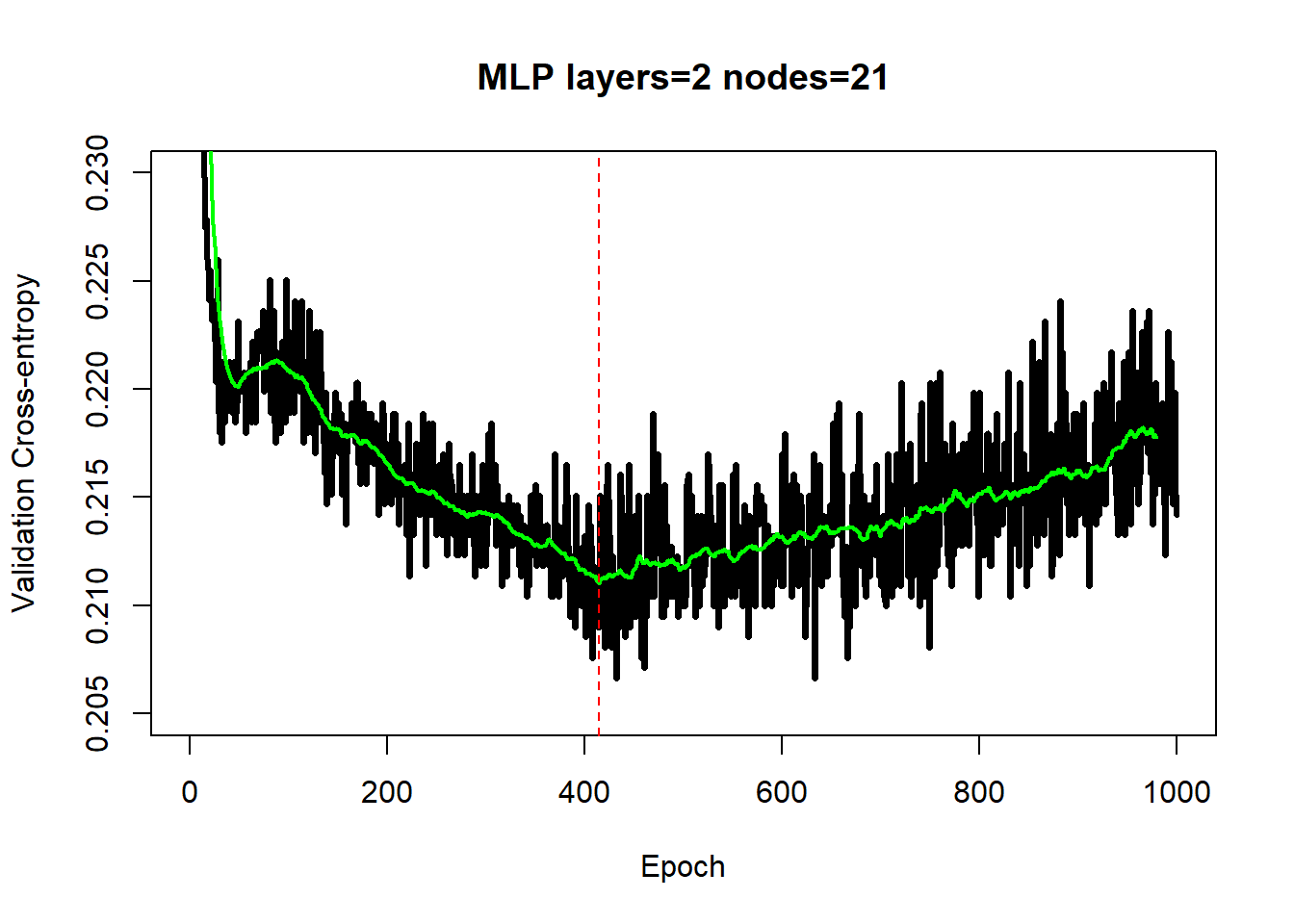 The plot below shows the history of the validation cross-entropy for the best of the six models. The history is much less smooth than for the regression example and as with all MLPs, it needs smoothing.