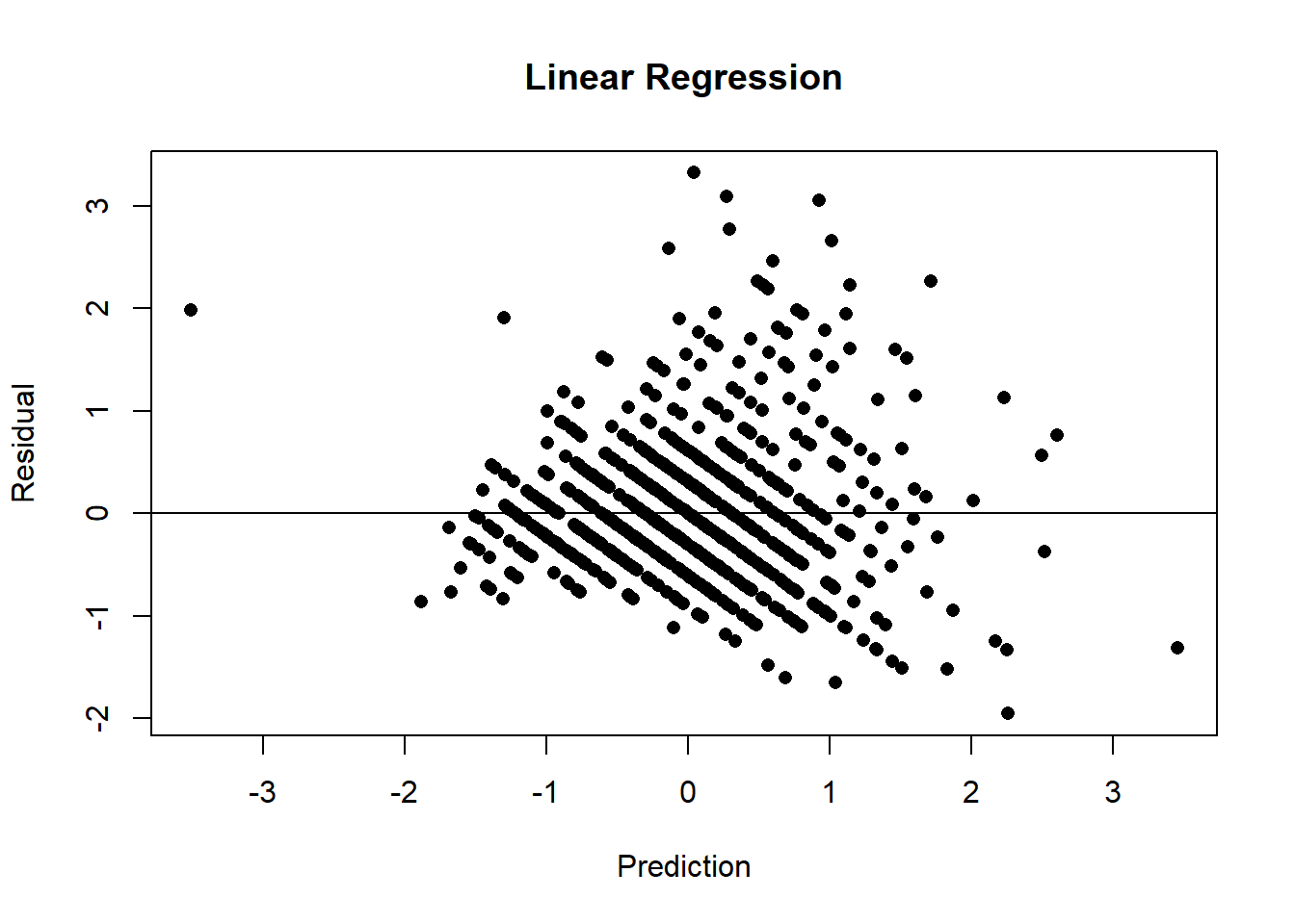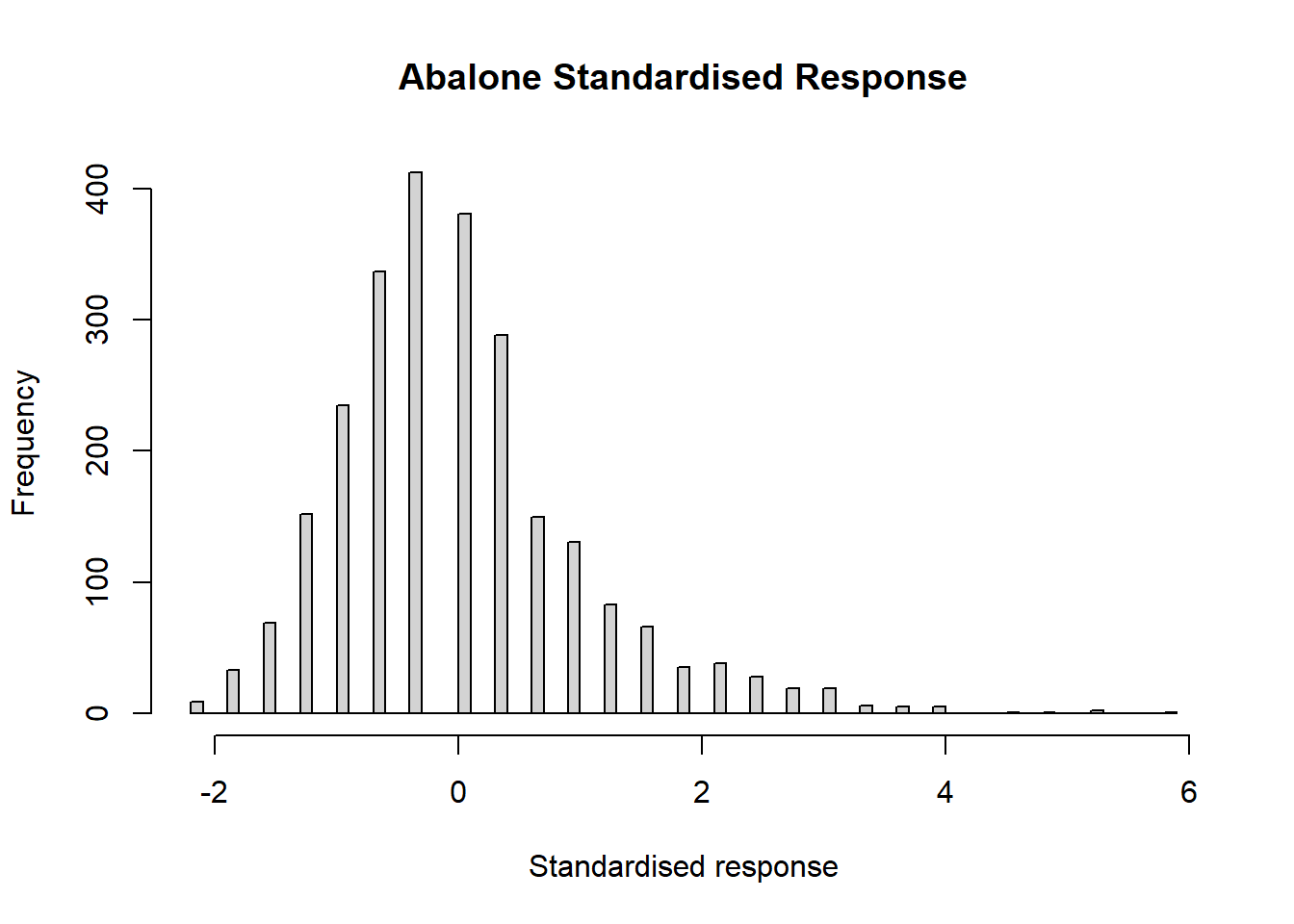 Using the prediction from this model, the residual mean square error (RMSE) in the validation data is 0.683. Because of the standardisation of the response this measure has characteristics that are very similar to R2 and it could reasonably be averaged across datasets. The baseline RMSE in the training data will be 1 and so the linear regression explains 100(1-RMSE2) or 53% of the variance. The residual plot below shows a striped pattern created by the integer nature of the unstandardised response and perhaps it also suggests that the variance is larger in older abalone.
