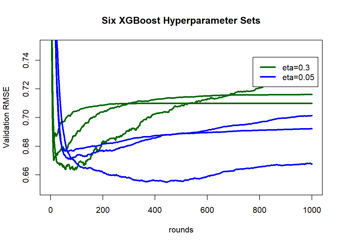 The XGBoost algorithm was run for 1000 rounds for each of six sets of parameters formed from crossing the learning rate (eta) equal to 0.05 or 0.2 and the maximum tree depth equal to 2, 6 or 9. A maximum tree depth of 6 is the default for the xgboost package.
