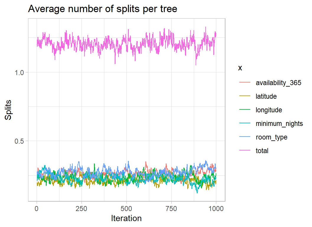 One interesting choice made when setting the priors is the probability with which the predictors are chosen when the model seeks to extend a tree. The default is to make each predictor equally likely to be tried, though of course, poorly performing predictors will get rejected and will not make it into the final model.