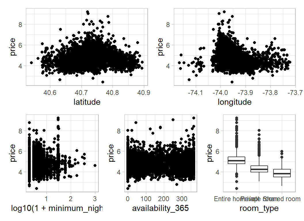 In my initial analysis, I predict price (already transformed to log(price+1)) from 5 of the predictors. Here is a plot that summarises the relationships between those predictors and price.