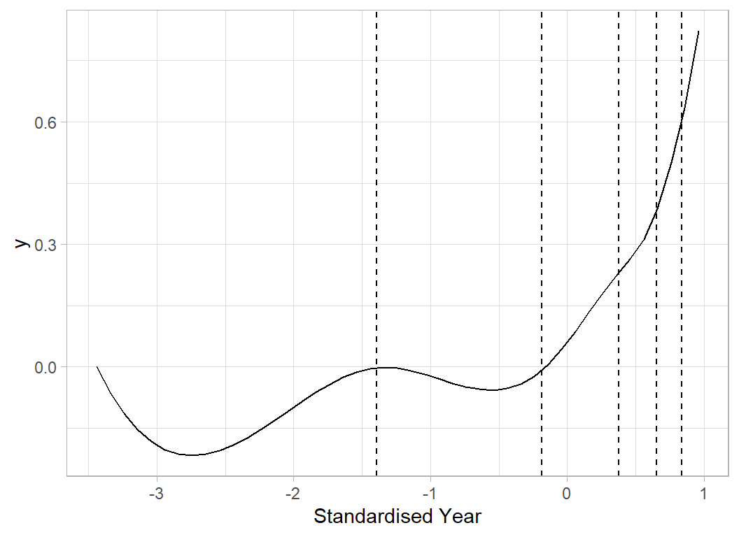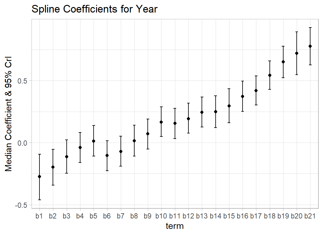 For my first model, I’ll use splines with 5 knots and because the number of knots is small there will be plenty of data between each knot and vague priors will suffice for the model coefficients.