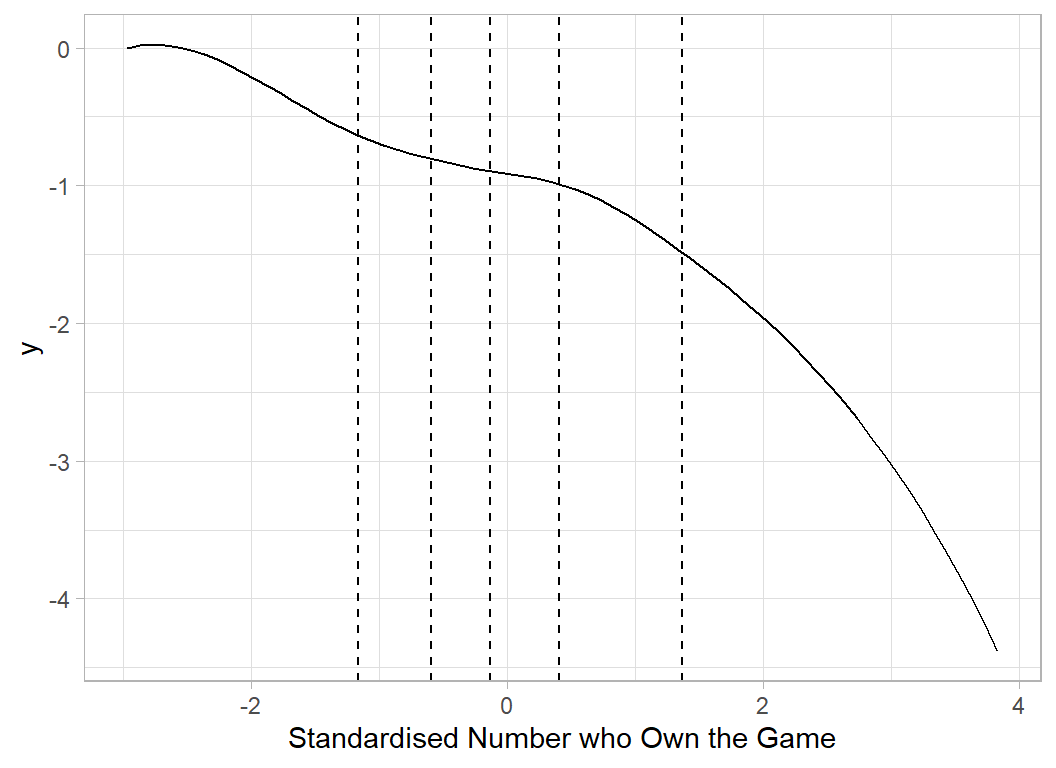 In my first Bayesian models, I have chosen to fit splines for year, num_votes and owned and to use quadratics for the other continuous predictors. A predictor such as age (minimum age to play the game) has a limited range of possible values and does not really justify a spline.