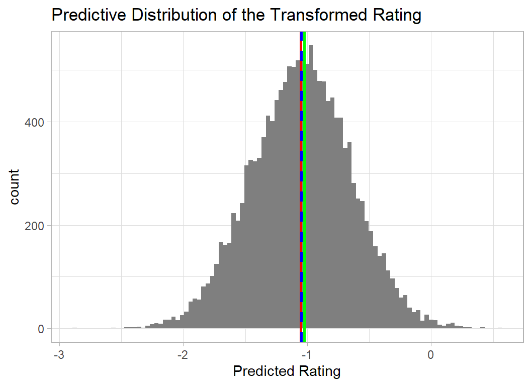 The predictive distribution tells us that the model anticipates a transformed rating between 0 and -2 with the most likely value being just below -1. The mean of the distribution (red) is very close to the true value (green).
