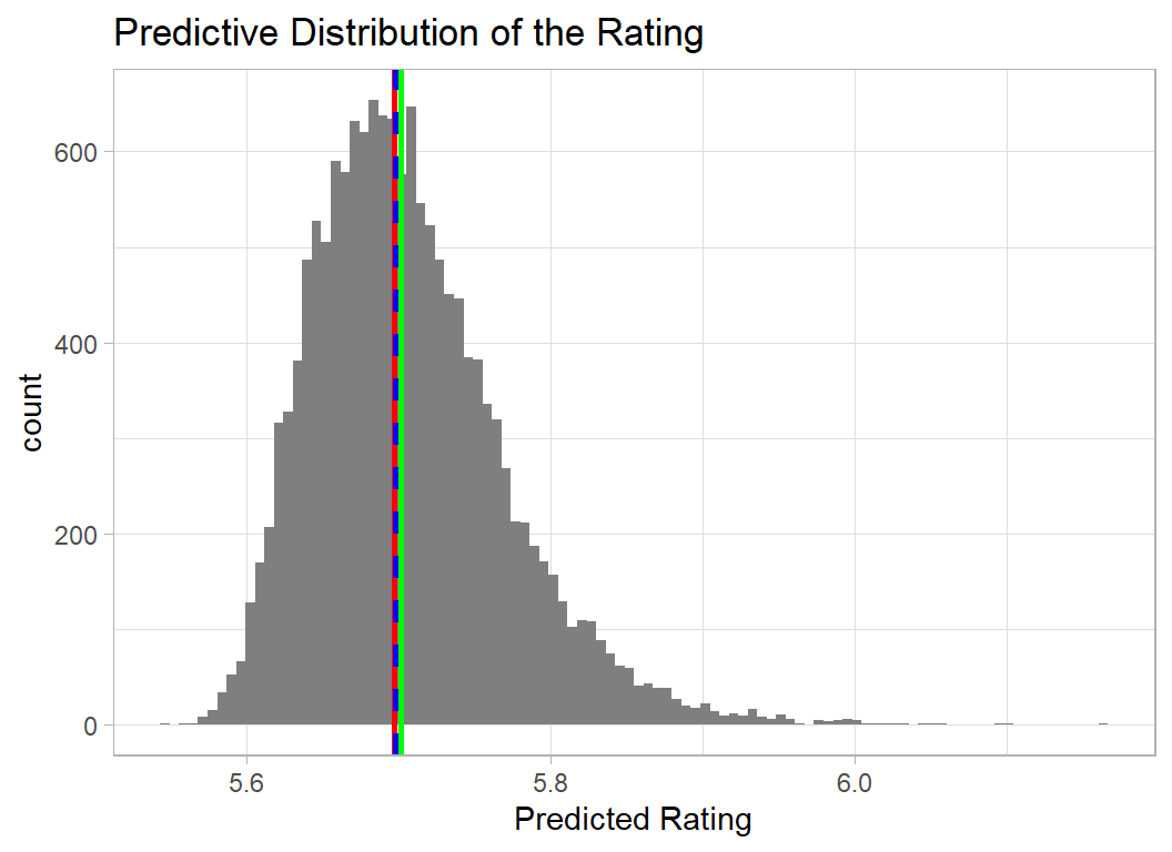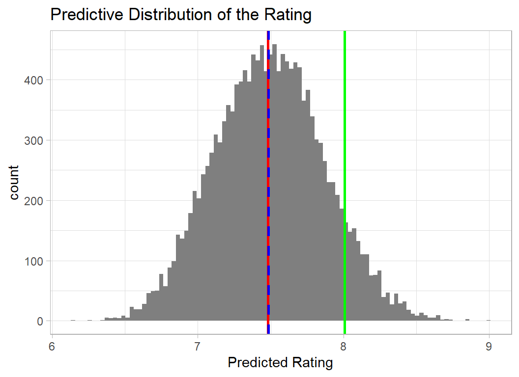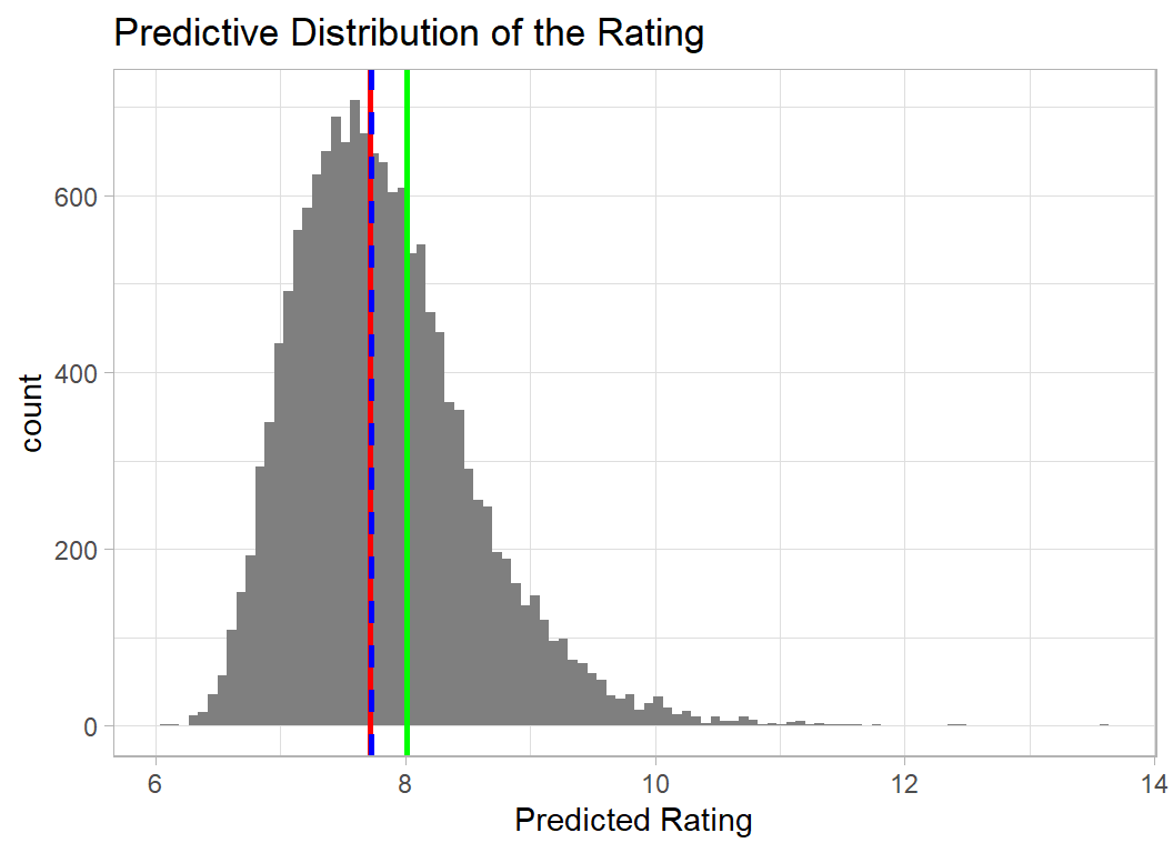 Game 1 is one of the least popular games, so I also look at the predictive distribution of one of the most popular. I’ve chosen row 2053 a game called Gaia Project, which has a rating of 8.00. I show the distribution on the original (0,10) scale.