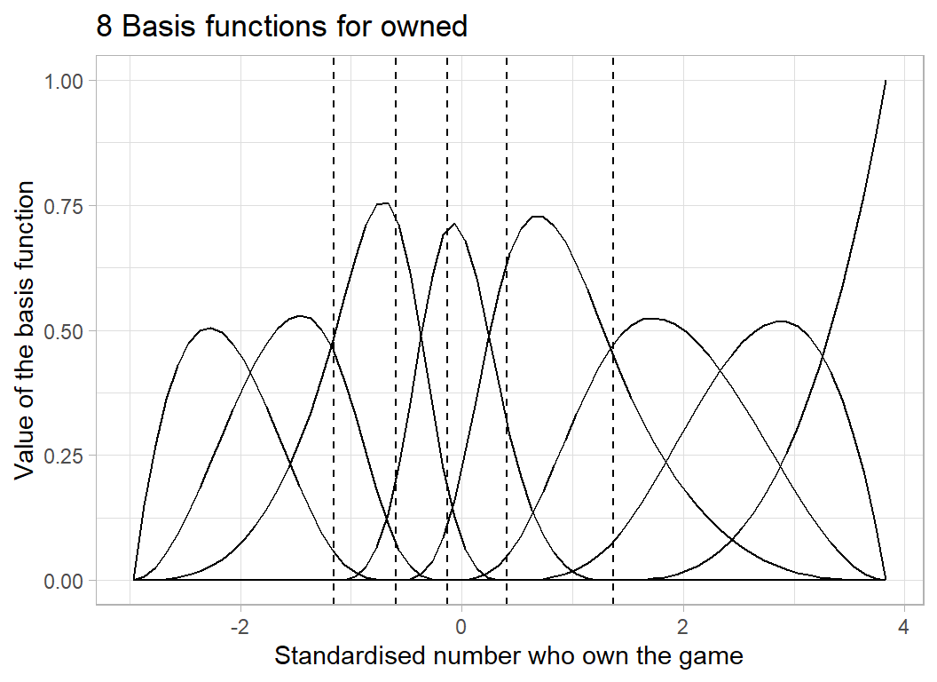 Let’s look at the 8 basis functions created for owned. The basis splines depend on the chosen knots plus boundary knots placed automatically at the minimum and maximum of the data.