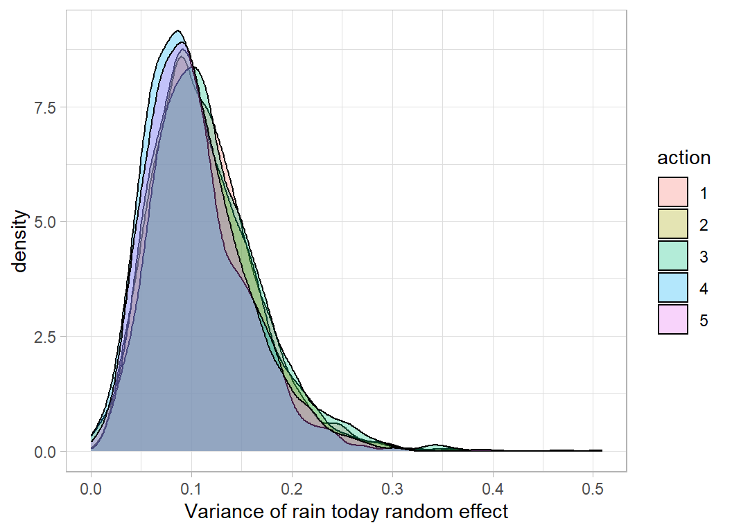 For illustration, I’ll take the coefficient of the fixed effect of rain_today and the variance of the corresponding random effect. Here are the posterior means and standard deviations, first by action and then overall.