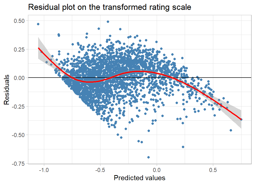 There is still a degree of skewness, but it does look as if the rating will be easier to model on this scale.