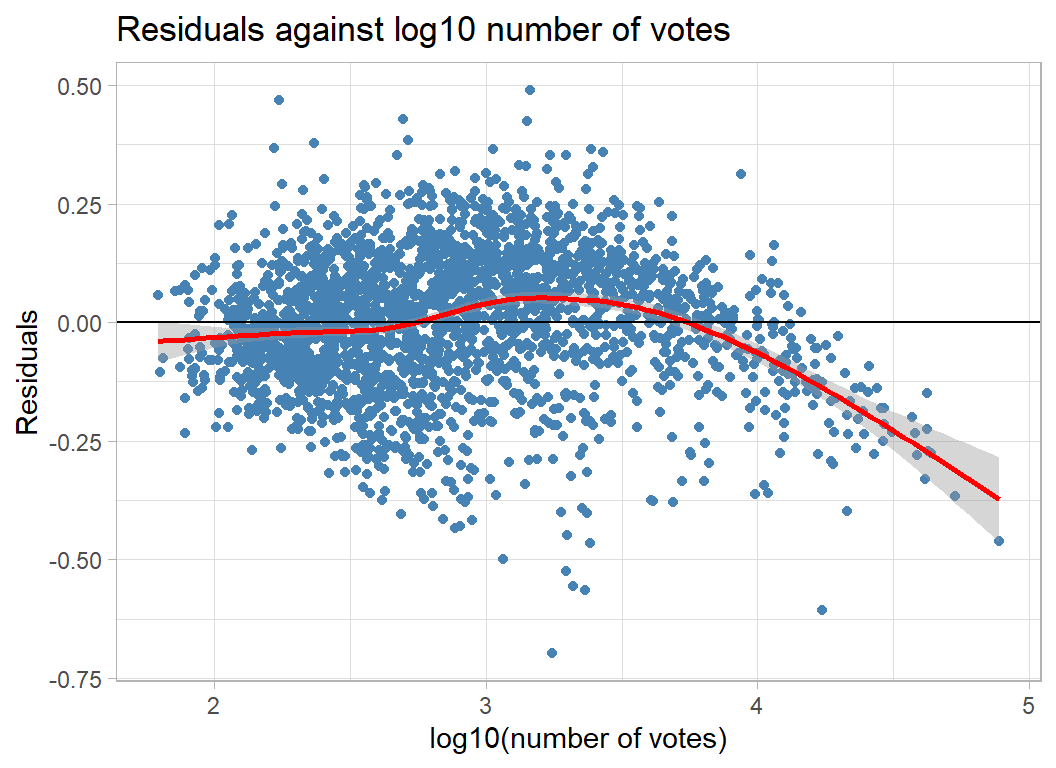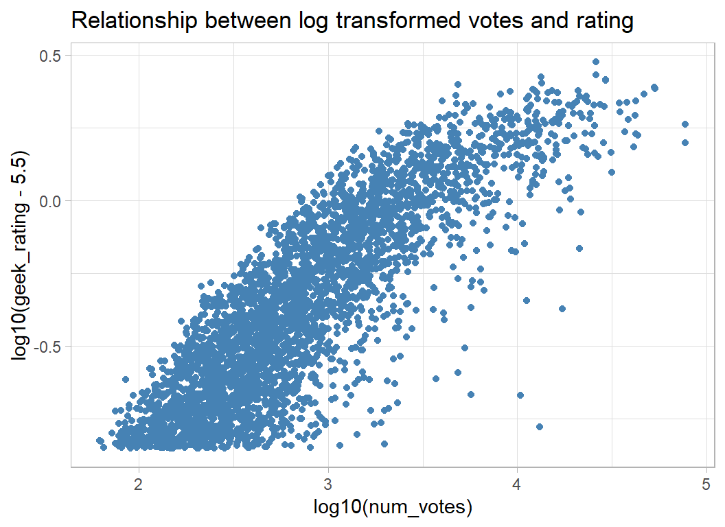 ggplot( aes(x=log10(num_votes), y=log10(geek_rating - 5.5)) ) +