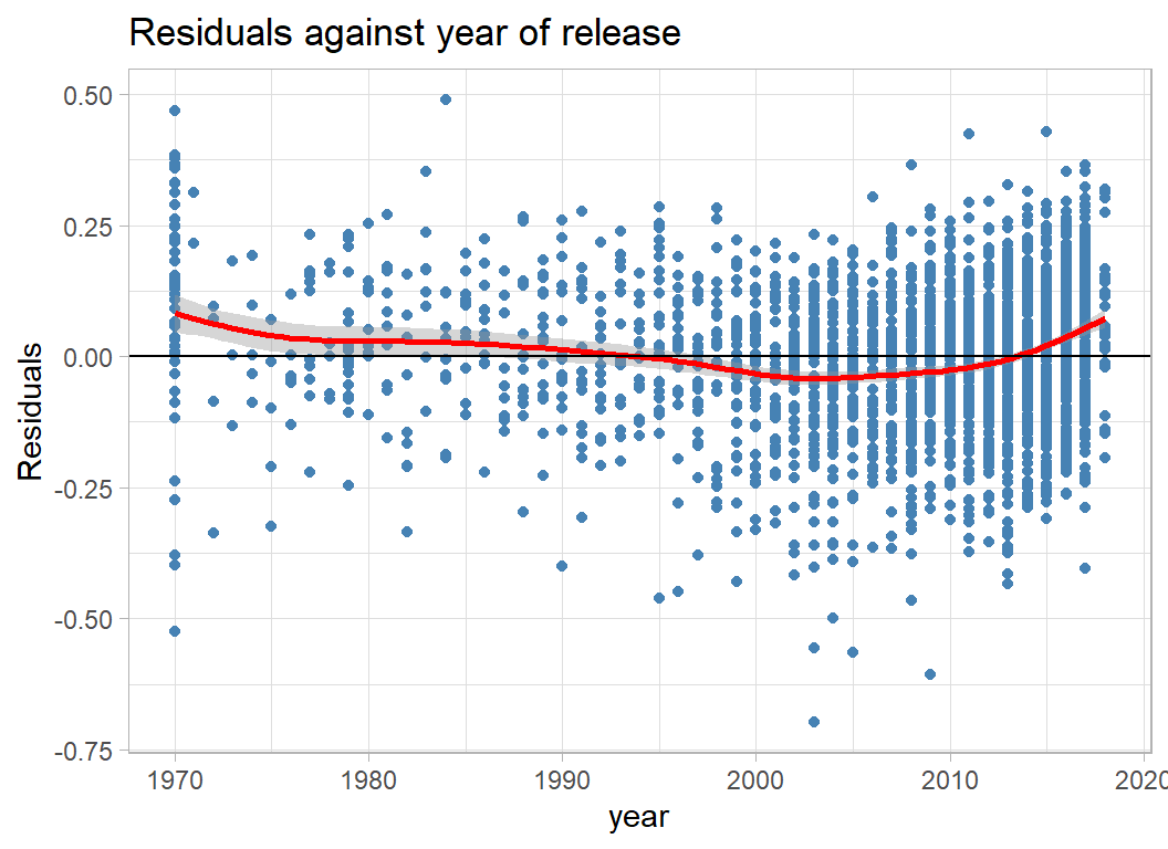 Perhaps, occasionally, Sliced should set a broader objective. For this episode, they could have withheld the data for games released after the start of 2018 and set the task of creating a model using pre-2018 data. I suspect that GAMs would perform better than boosted trees in such a competition, because boosted trees are more likely to follow blips in the data. The blips are actually present in the training data, so they will be duplicated when the data are split at random, but they may well not be seen in an independently collected data set.
