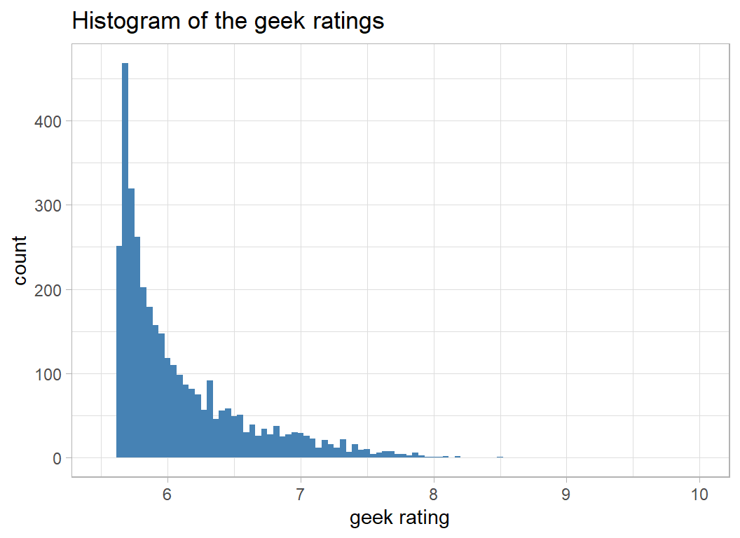 The distribution of geek_rating is very skew with most ratings lying quite close to 5.5, the score that a game would get if nobody voted.