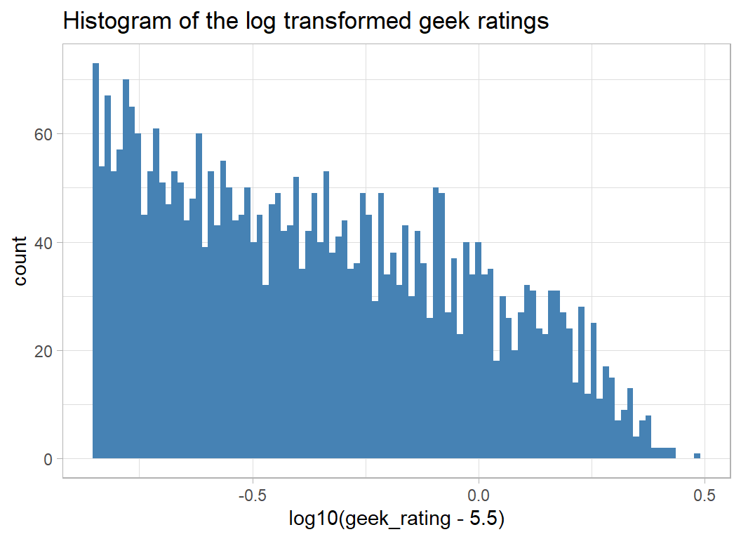 The evaluation of performance is made in terms of the RMSE of the prediction of geek_rating, which argues for working on the original scale, but my suspicion is that linear models will fit better on a log scale and it is a simple matter to convert the predictions back to the original scale.