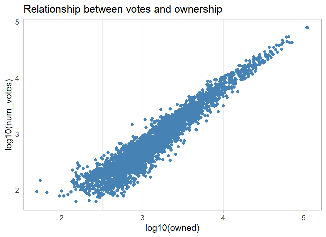 ggplot( aes(x=log10(owned), y=log10(num_votes)) ) +