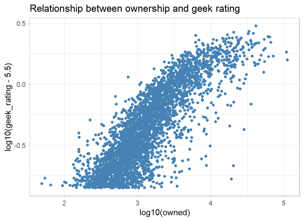 ggplot( aes(x=log10(owned), y=log10(geek_rating - 5.5)) ) +