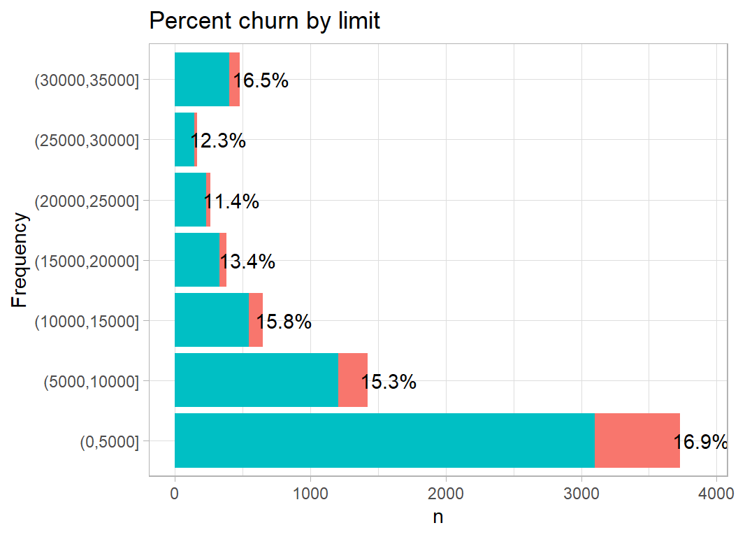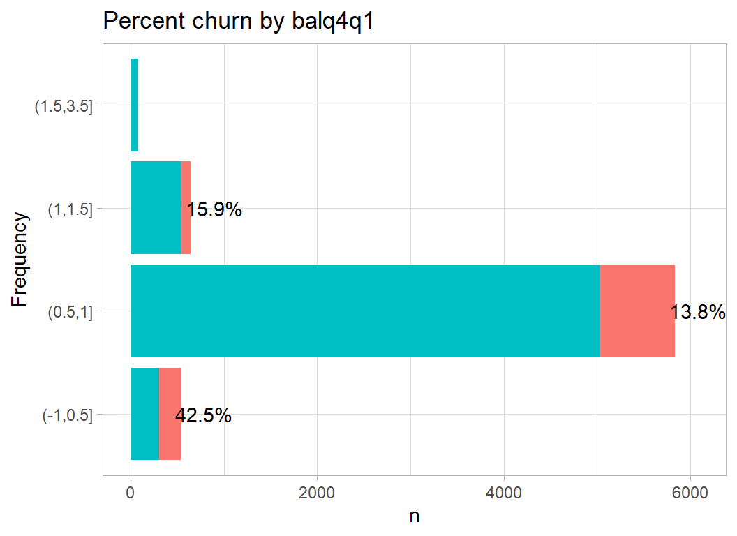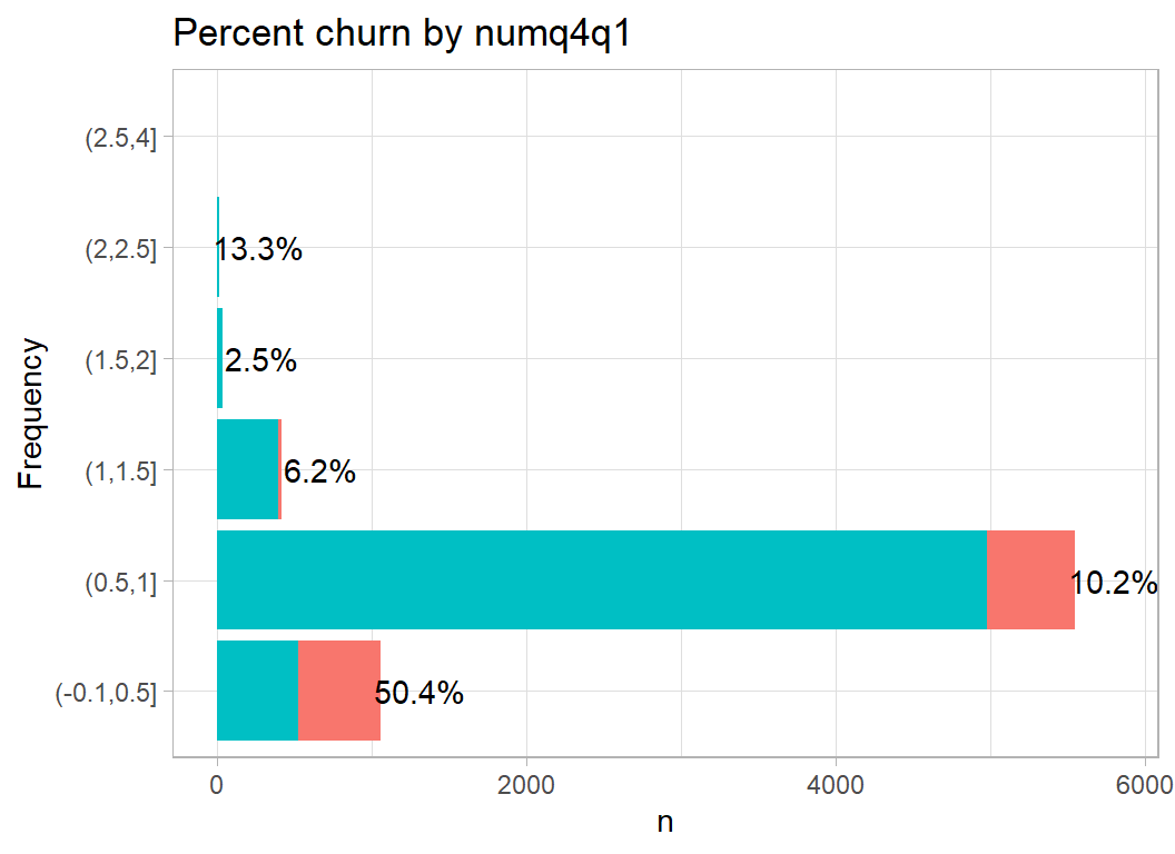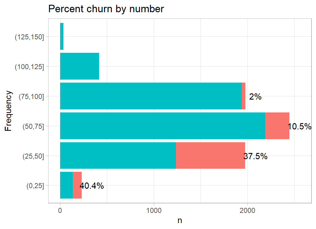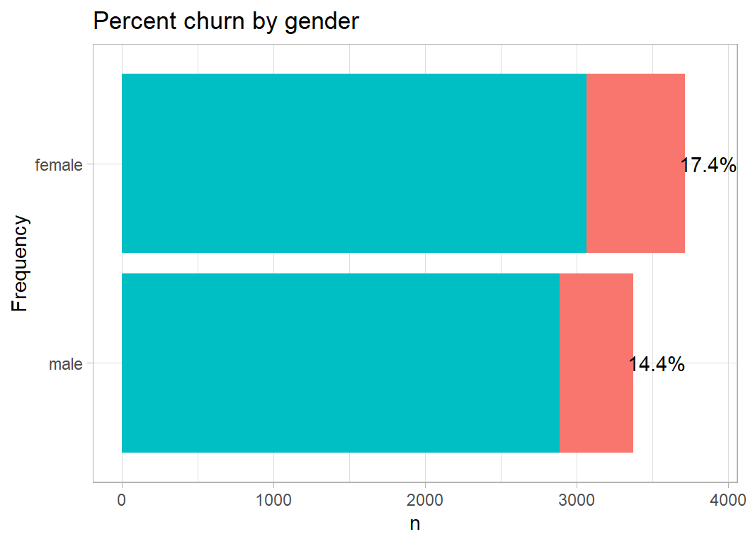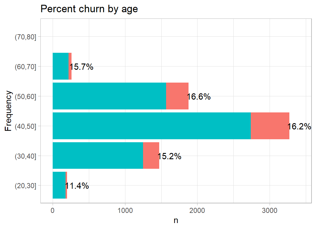 Although I want to make some multivariate plots, I think that it is still important to start with a univariate exploration. An earlier episode of Sliced (s01-e04) looked at wildlife strikes on aircraft and for that analysis I created a function to plot the percentage of aircraft that were damaged. The same type of plot will work well for these data; I’ve called this function plot_churn(), but the code is essentially the same as I wrote before.
