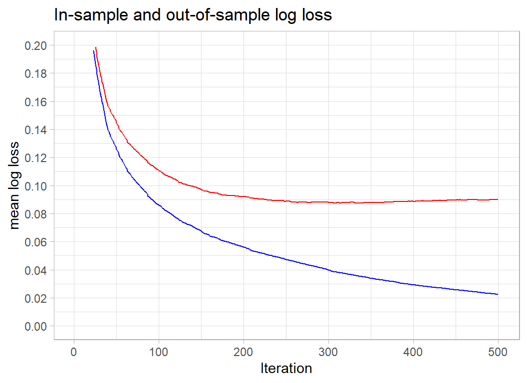 Obviously, there is huge overfitting. If we concentrate on the out of sample (validation) measure shown in red, it appears that 500 iterations overshots the best solution, which is found after after 336 iterations when the out-of-sample logloss is 0.08736.