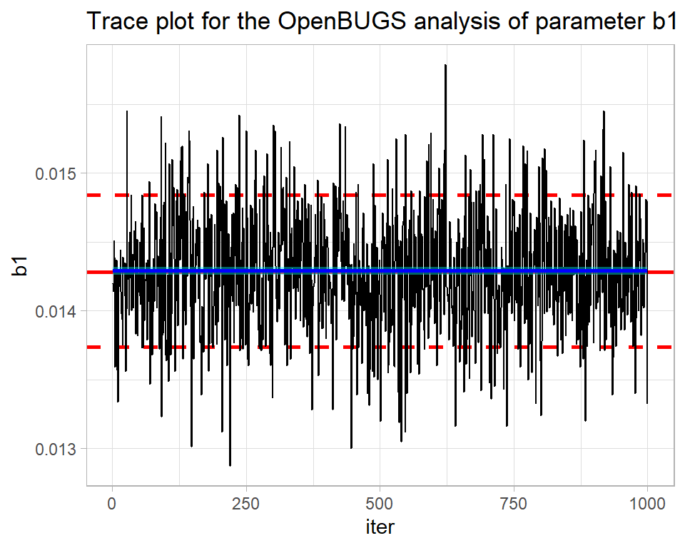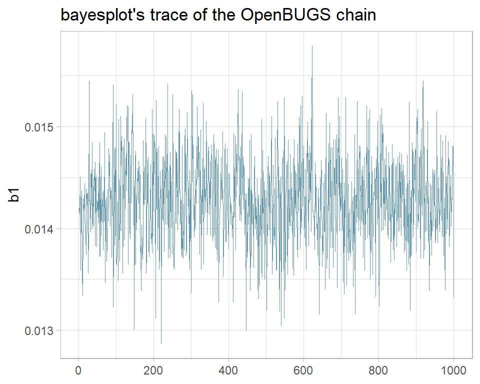 The contrast could hardly be more stark. This chain is struggling to find the posterior (drift) and the smooth is anything but straight and horizontal. The algorithm ends in the right ballpark with a median estimate of b1 is about 0.014, but without the OpenBUGS analysis for comparison, I would not have any confidence in that estimate.