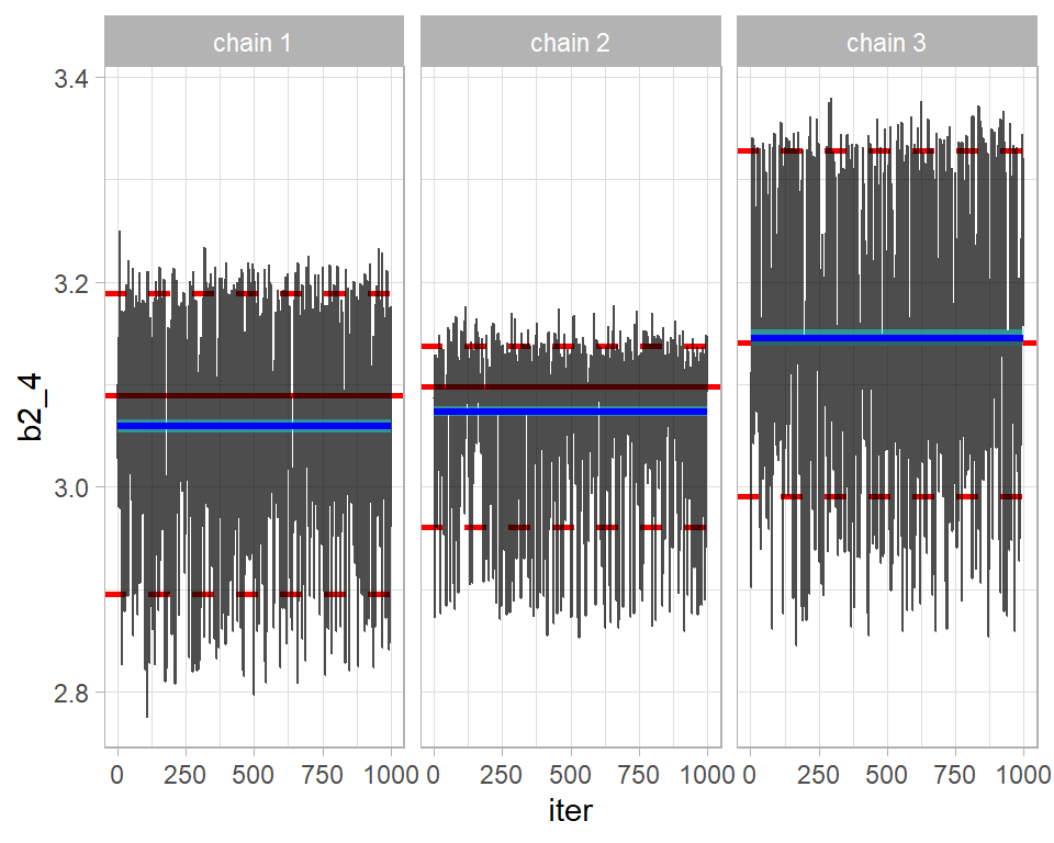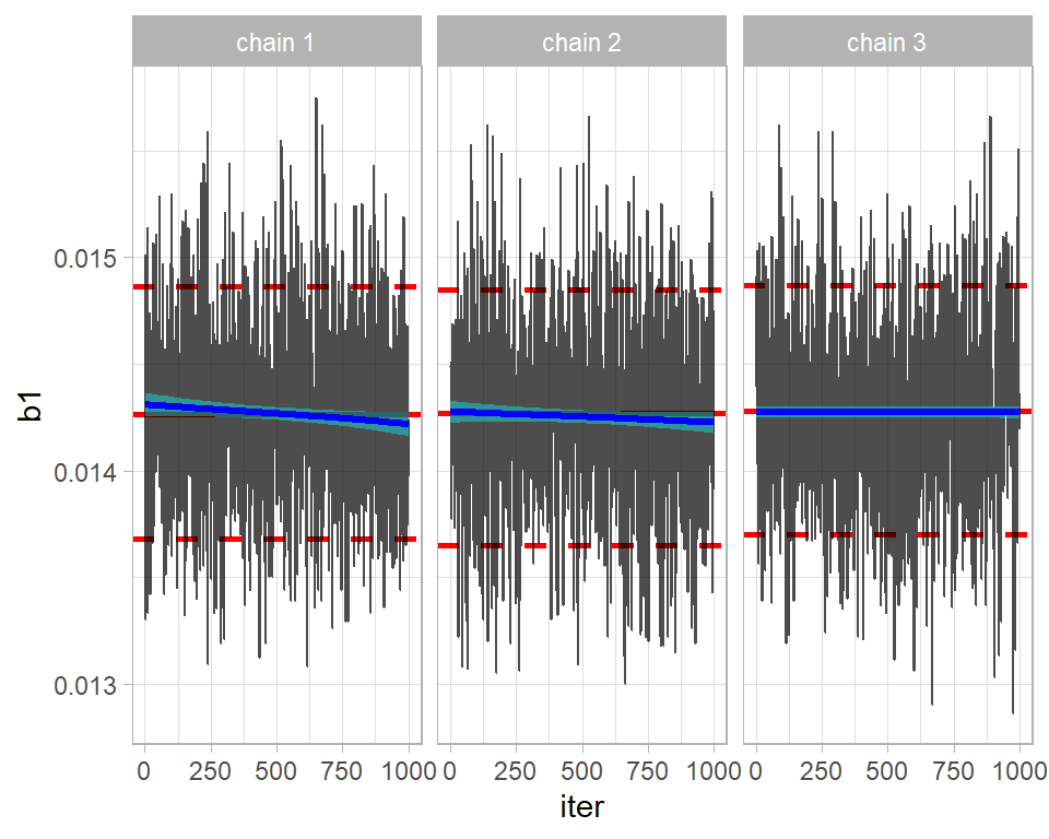 There are several packages that will make a trace plot of a single chain, but the task is so straightforward that one might as well code it for oneself using ggplot2. For convenience I have created my own function called trace_plot() that I present in the appendix to this post. I supplement my trace plot with horizontal lines representing the 10%, 50% and 90% quantiles of the simulations and by a smoother that helps the eye detect any trend.
