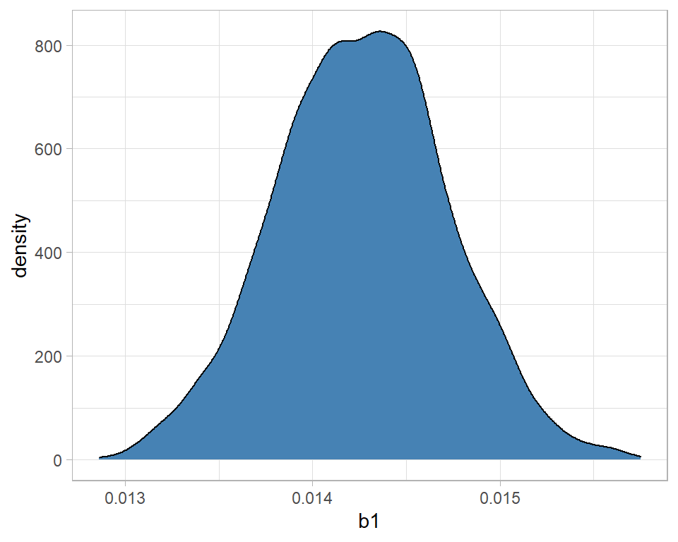 From the plot, we can see that the parameter b1 has a posterior mean of about 0.0144 and there is a high probability that its true value is somewhere between about 0.0138 and 0.0148.