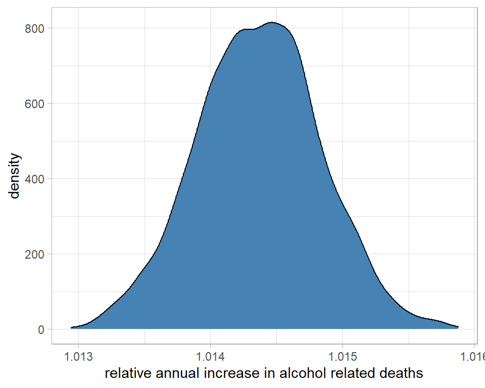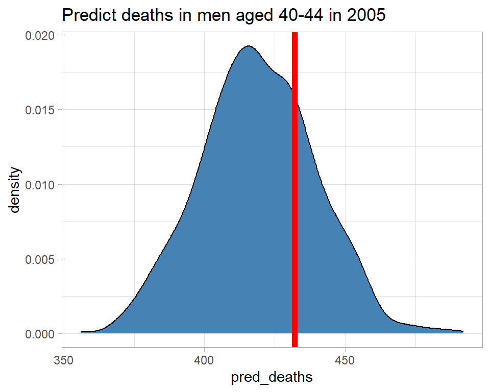 It looks as though the model did a particularly poor job of predicting for men aged 70-74 in 2018, so let’s look at that particular predictive distribution.