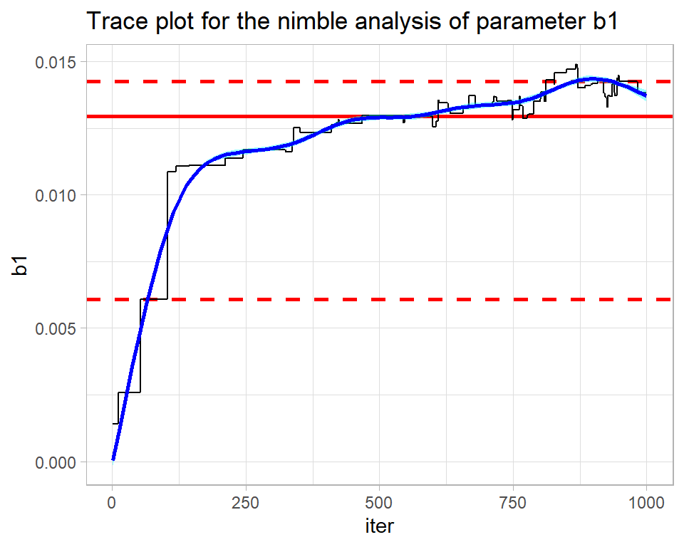 The mixing is also poor. The flat regions within the trace show how the algorithm is getting stuck at the same value. nimble uses a Metropolis-Hastings algorithm, so when a proposal is rejected the algorithm repeats the current value. The flat regions extend over up to 50 iterations indicating the time needed before a proposal is accepted. There are theoretical papers that suggest that for a high-dimensional distribution, the ideal is accept on average every 4th proposal. An even higher acceptance rate might seem preferable, but it would mean that the proposed moves are too similar to the current value and such very short moves will be slow to cover the posterior.